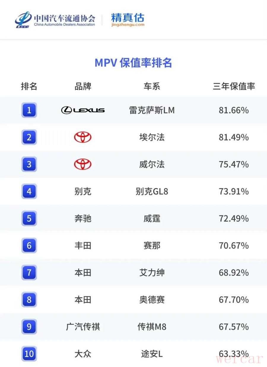 至于中大型SUV,目前市场在售车型以进口车型为主,且车型较少,所以诸如奔驰G级、保时捷Cayenne、路虎卫士等车型的保值率高的惊人,三年保值率分别为88.36%、79.30%和73.65%。当然,这些车型保值率这么高的主要原因还是因为市场稀缺。MPV的情况和中大型SUV一样,雷克萨斯LM、丰田埃尔法、丰田威尔法三年保值率分别高达81.66%、81.49%和75.47%。