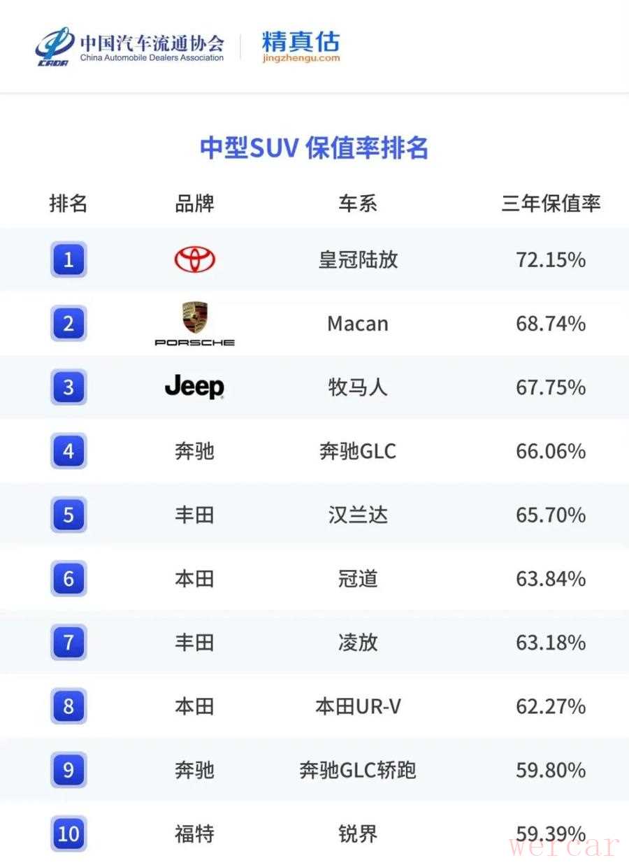 在中型SUV领域中,丰田皇冠陆放以72.15%的保值率位居榜首位置,此外,包括保时捷Macan、牧马人、奔驰GLC、汉兰达四款车型均进入榜单前五名,保值率分别为68.74%、67.75%、66.06%和65.70%。