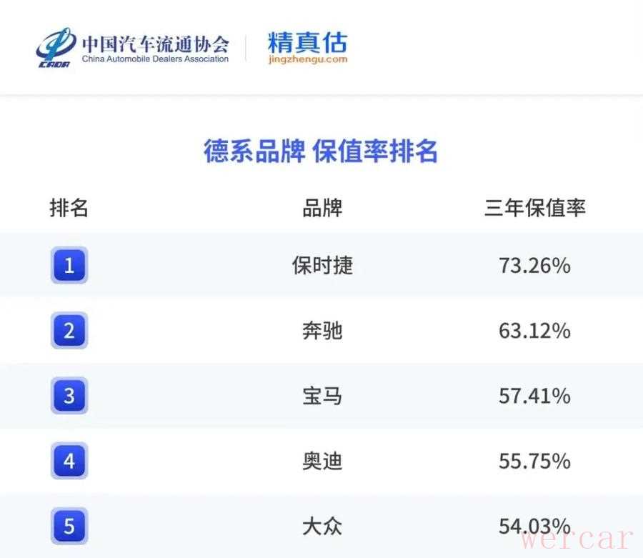 接着再来看看各国别品牌的三年保值率表现,德系保时捷以73.26%的三年保值率稳居第一,是唯一保值率超过70%的品牌,远高于日系雷克萨斯,后者保值率为59.35%。在德系品牌中,奔驰、宝马、奥迪分别以63.12%、57.41%、55.75%的三年保值率排名第二至第四名;大众保值率为54.03%。