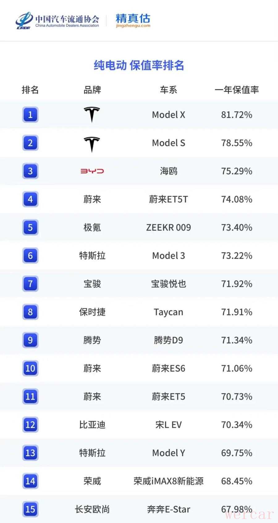 当前,新能源汽车快速增长,并且已成为全球汽车市场增长的动力,不过因为目前市面上的绝大多数电动车销售都还不到3年,所以无法统计3年保值率,于是中国汽车流通协会给出了1年保值率排名,这份榜单有一定参考意义,但榜单参考意义也比较有限。其中,纯电动车型中,进入一年保值率前三名的车型分别为特斯拉Model X、特斯拉Model S以及比亚迪海鸥,保值率分别为81.72%、78.55%和75.29%。