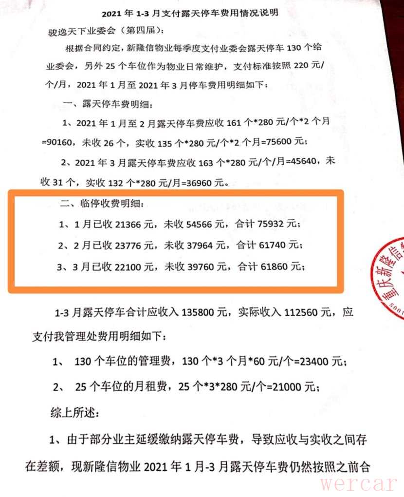 殷主任指出,小区除月票车以外,临时停车收费每月超5万元(目前双方对账明细中,临时停车未收费部分的金额,是业委会及时向业主通报物业侵占该部分公区收益后,业主自发拒缴行为。在这之前,由于上两届业委会的隐瞒,业主都是稀里糊涂的缴纳了该临时停车费),这部分物业从收费开始到现在,也是一分未支付给业主。若按10年计算,金额高达600万。