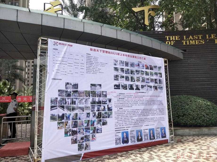 7月11日,位于南岸区丹龙路26号的骏逸天下小区入口处,摆放了一个巨型喷绘。该喷绘由小区新隆信物业制作,宣传内容为“骏逸天下管理处2021年上半年物业服务工作汇报”。从小区入口经过的业主,大多都会在此停留,并看上几眼。