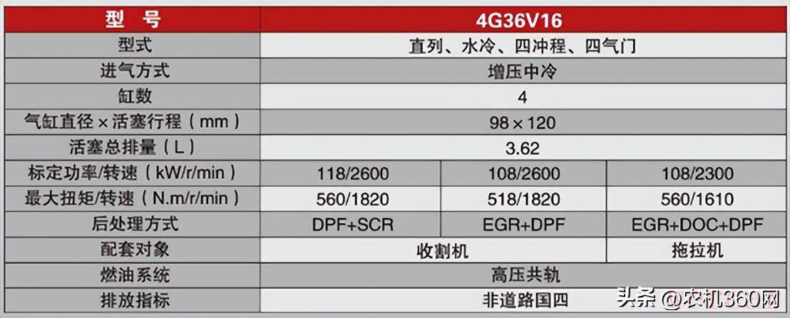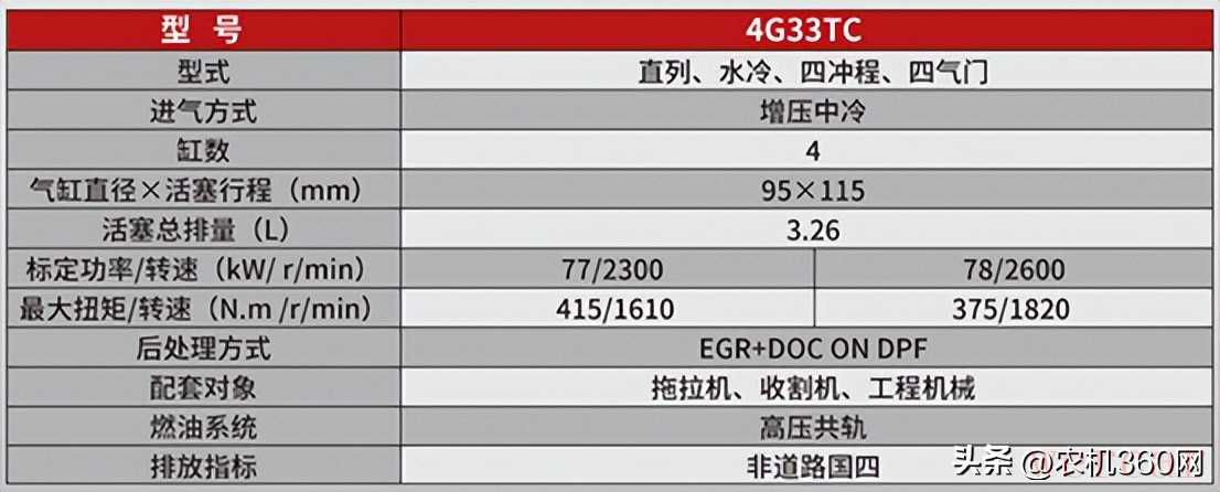 推荐词:谁说农机不能跑远路?技术特点1、采用车用发动机先进技术与设计方法,倾力打造的第一代长行程非道路专用发动机;2、具有扭矩储备大、燃油经济性好与噪声小、振动低等特点;3、针对非道路柴油机对可靠性、扭矩储备及排放法规要求,机体采用整体主轴承盖结构,配以镶套、内冷油道冷却活塞、深沟槽滚压曲轴、胀断连杆等全面提升可靠性;4、采用钧风电控科技有限公司为非道路柴油机专门开发的高压共轨燃油系统;5、选择EGR+DOC ON DPF后处理技术路线来满足非道路国4排放法规,性价比更高;技术参数: