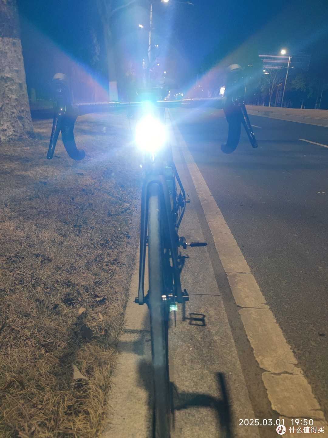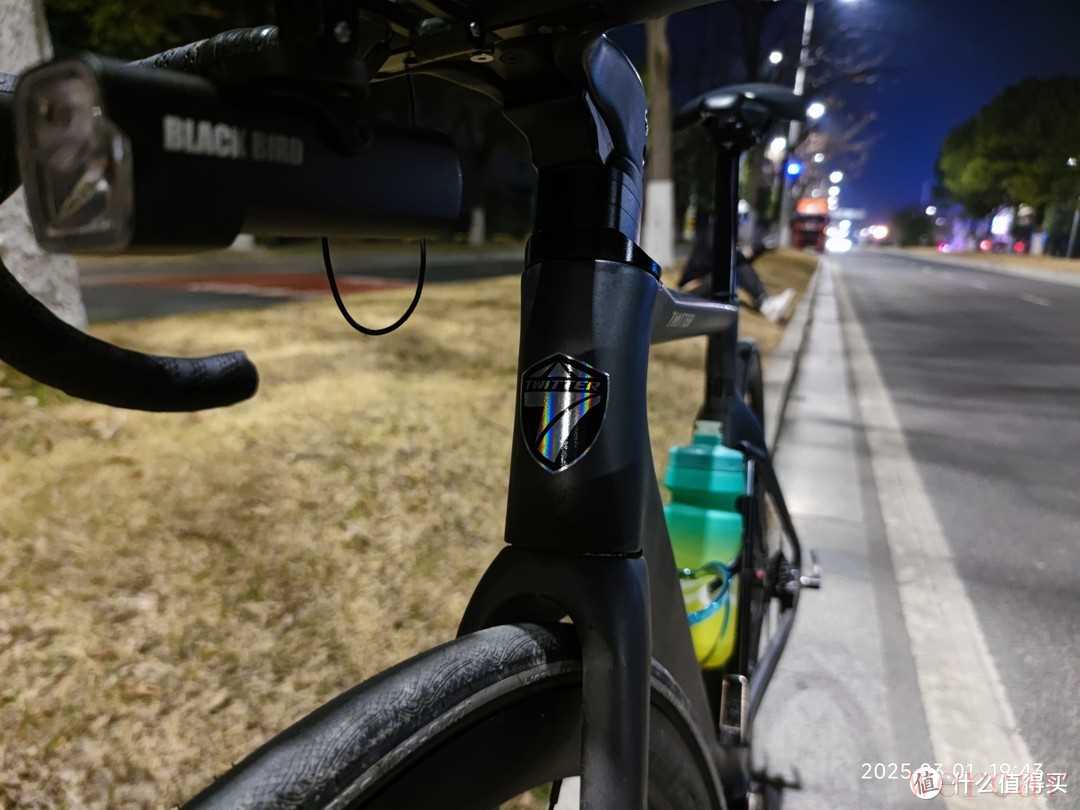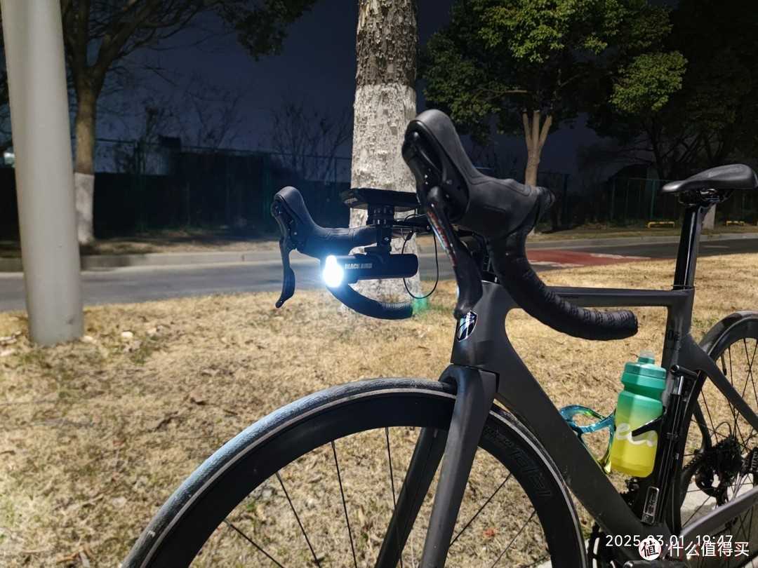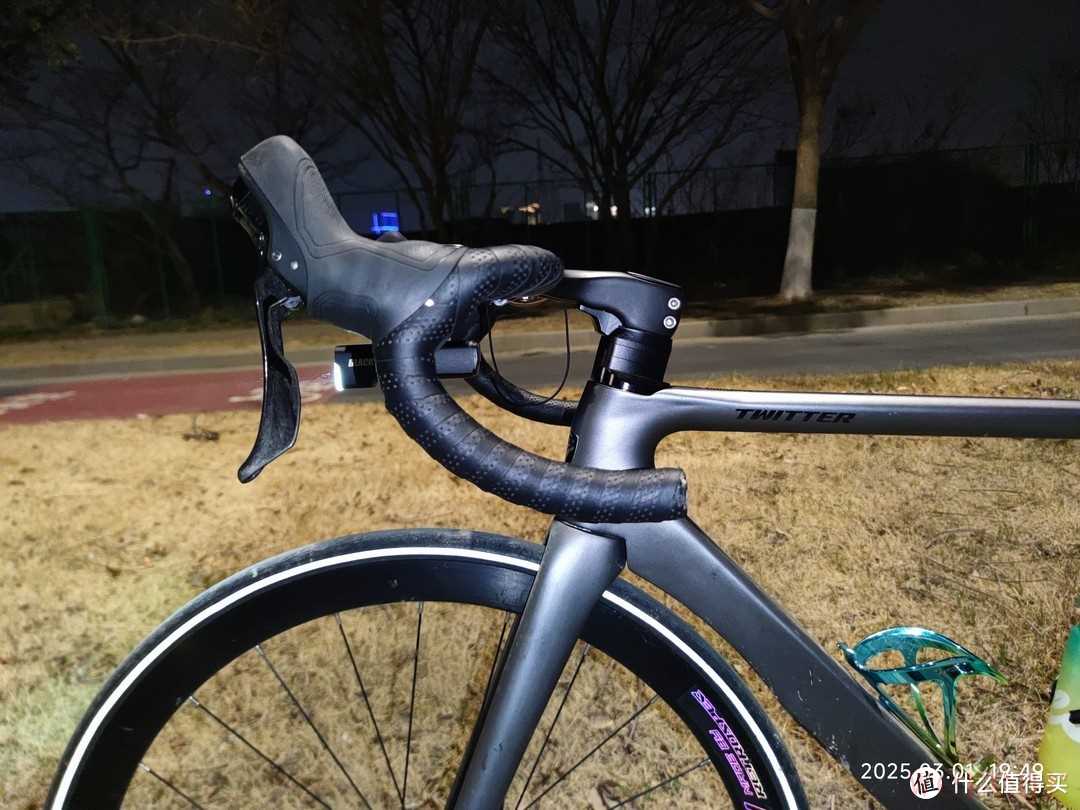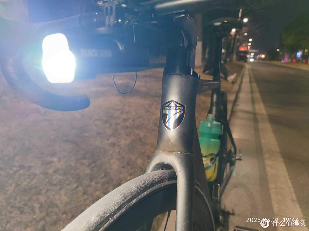 夜间骑行最需要注意的就是安全,虽然我都会选择比较亮的路面骑行,但是我还是为自己装了一个骑行灯。骑行灯很亮,足够照亮我前进的道路。龙头下面有一个大写的“T”的铭牌,这是骓特logo,他的设计还是挺好看的,在灯光下视觉角度不同,就可以呈现出不同的色彩。