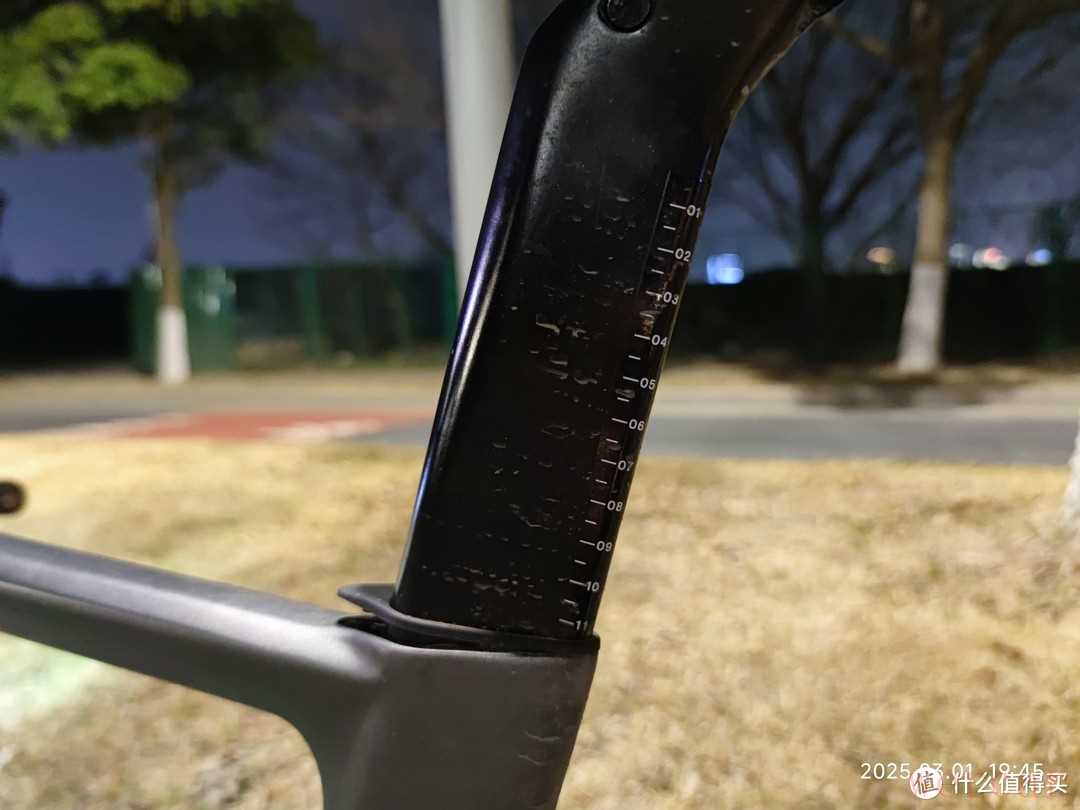 这个车坐管也是碳纤维材料做成,据同事说可以调节到15公分左右,我没有完全拉出来试过,因为我的个子比较小,根本不需要把它全部拉出来。坐管上面的刻度非常的友好,让我可以很轻松的找到适合自己的坐垫骑行位置。