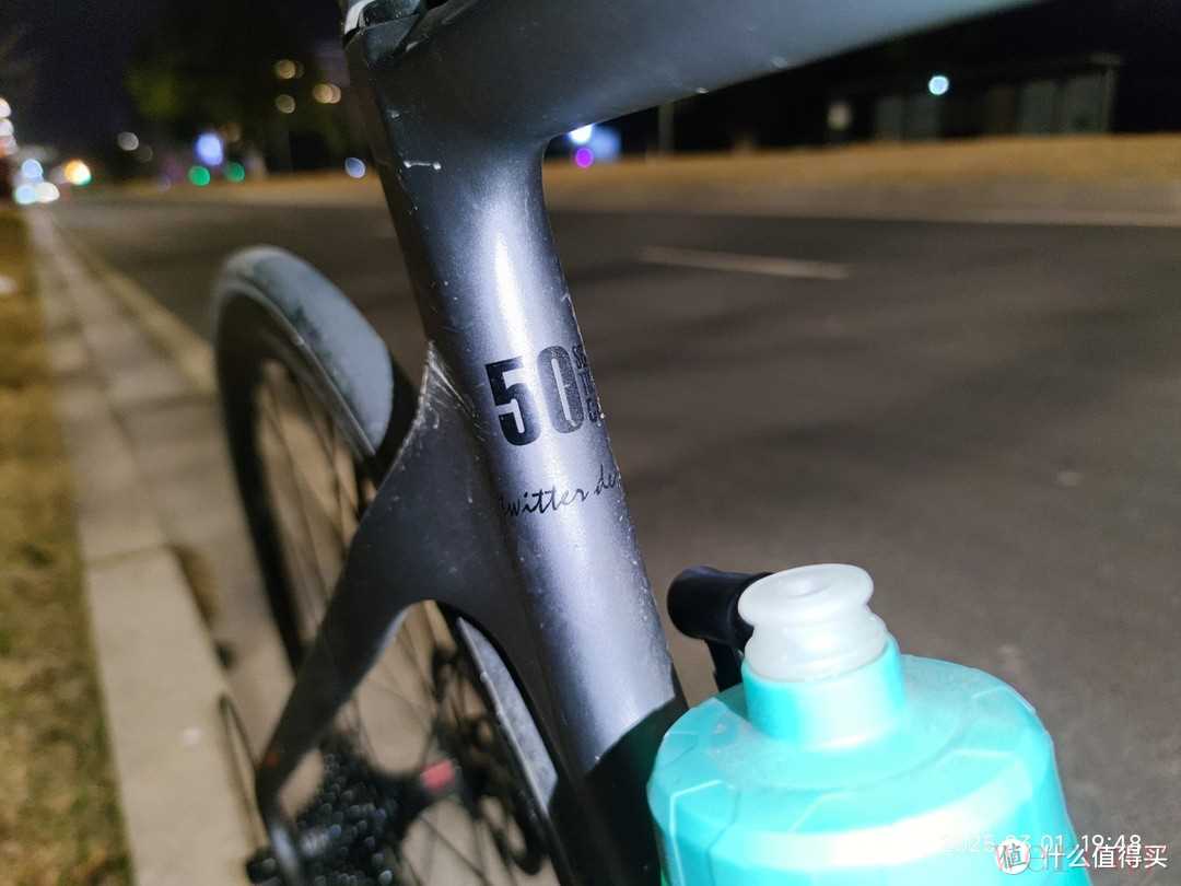 整个车架都是碳纤维做成,都是内走线线的设计,看起来整体感非常强。车竖梁上面的50代表了它的型号,按照骓特的参考身高来算,这个尺寸的适合175~180的身高来骑行。对于我来说,他有点高了!不过想着自己在还不到1米2的时候都学会了骑28大杠自行车,这个车架的高度真的不算什么。