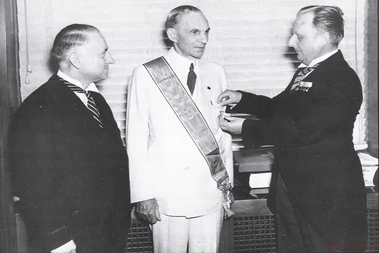 希特勒非常崇拜福特,亨利·福特庆祝他的八十大寿的时候,希特勒还派代表专门到了美国密歇根州的高地公园,为福特祝寿,并为他送上大十字勋章以及德意志雄鹰勋章,这是纳粹德国颁给外国人的最高荣誉。