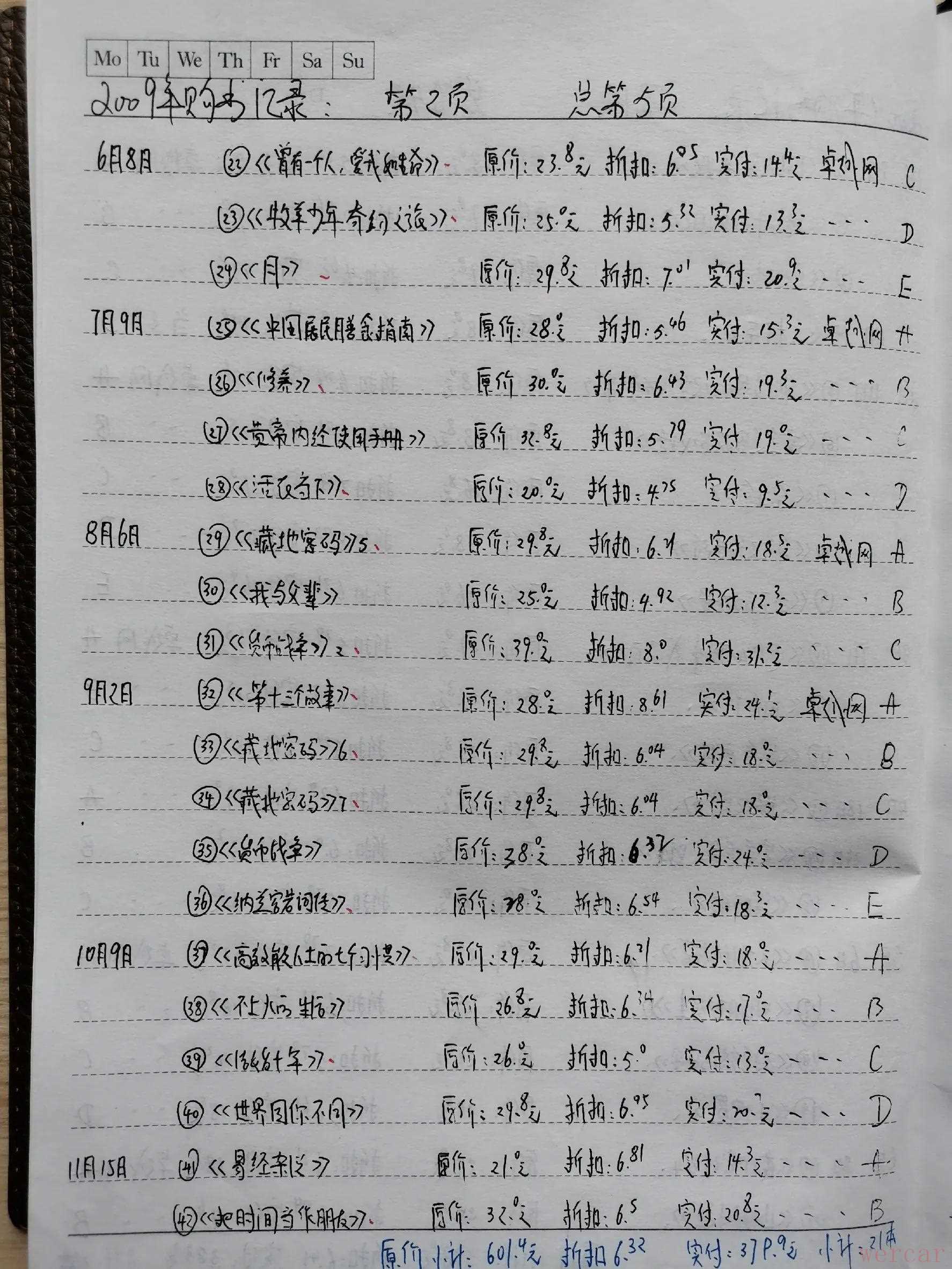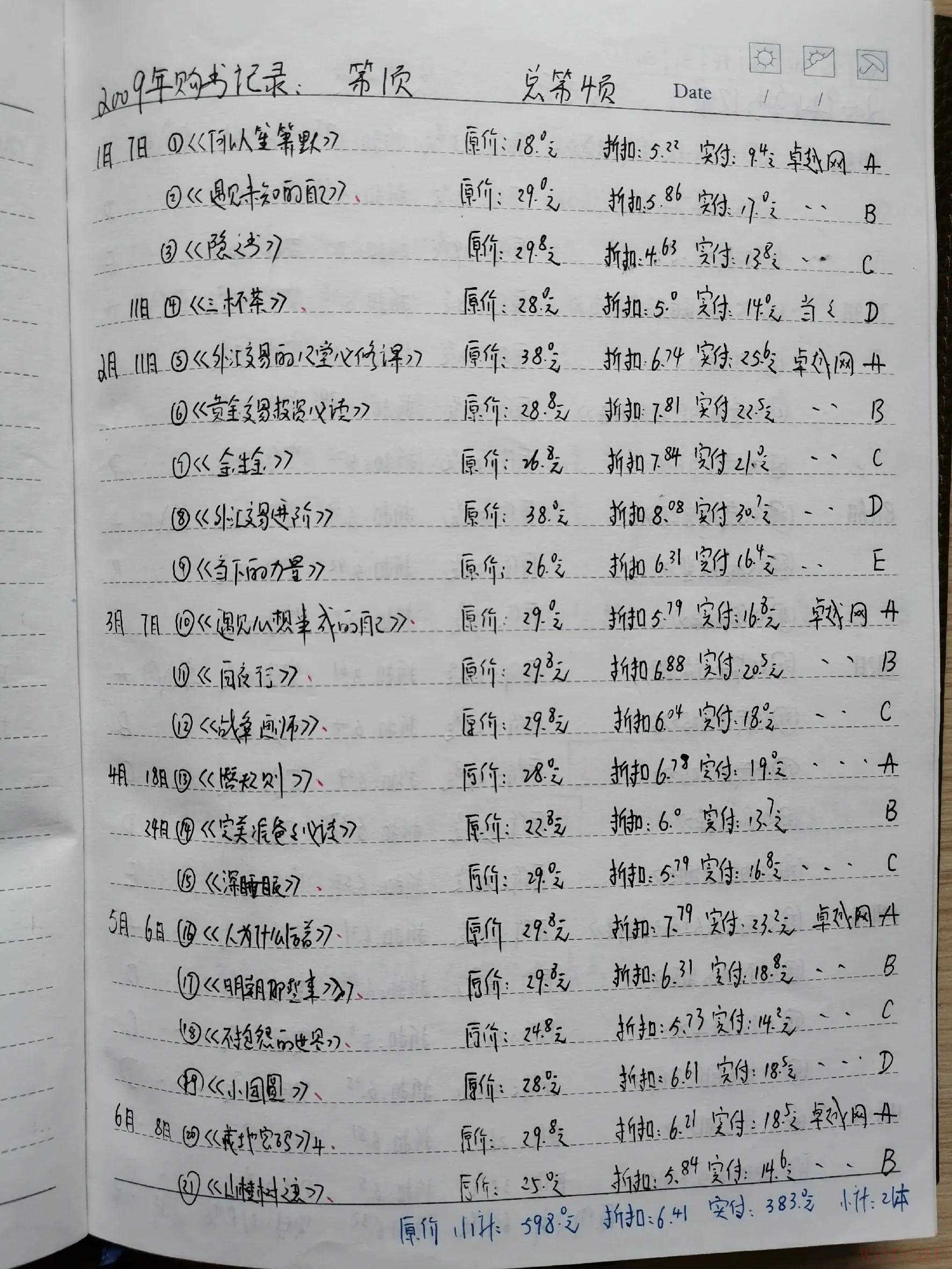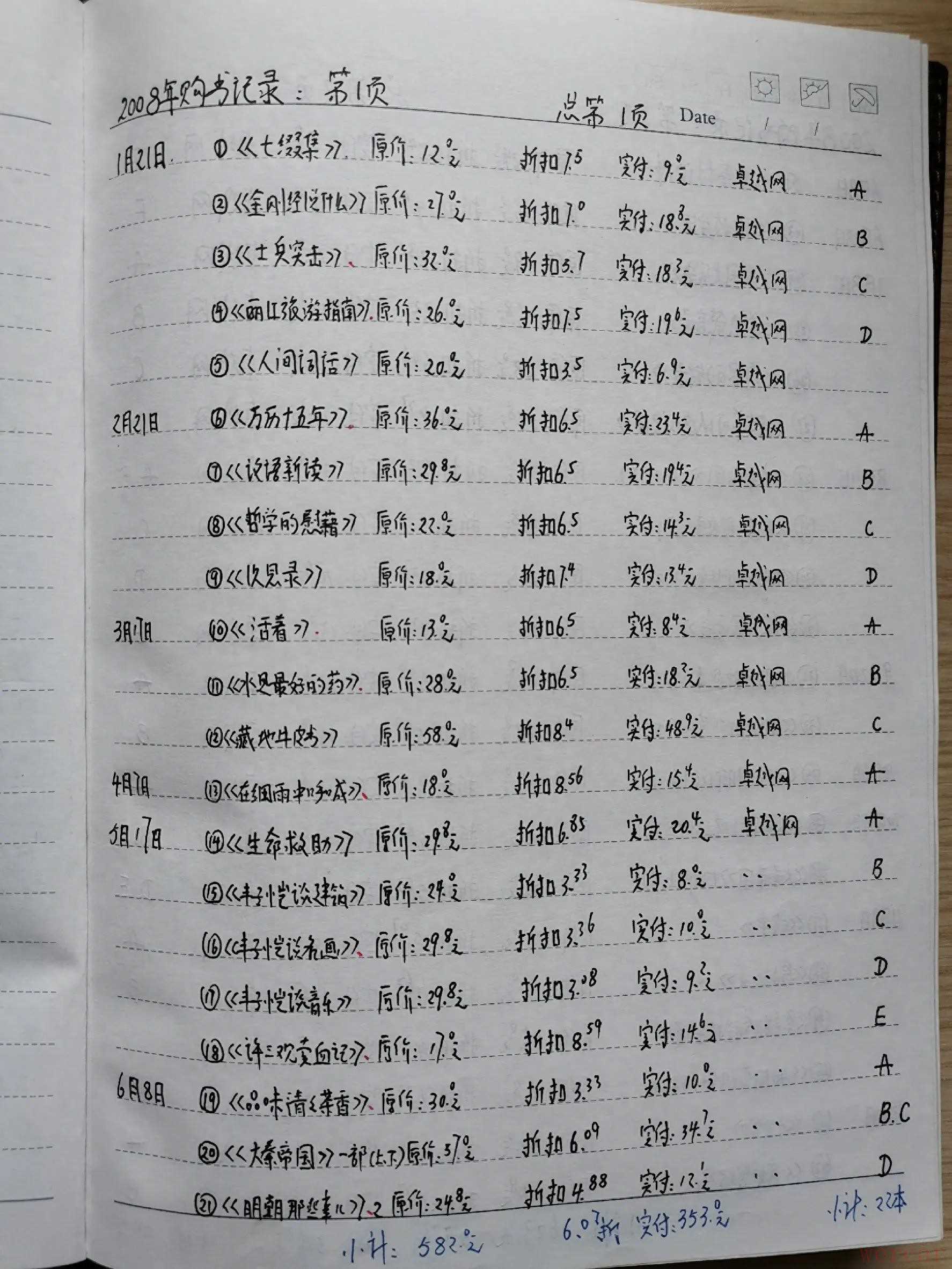 今天整理书柜时,看到了之前的购书清单。回想自己的购书过程,1997年到2005年期间,都是在书店里买书,那时常去一家【科普书店】里选书,与老板熟识后,买了很多三、四折扣的图书,很过瘾。2005年开始,逐步在卓越网、当当网上买书,因为价格便宜、配送方便,就很少在书店买书了。2009年开始了淘宝购物后,2012年以后就陆续从淘宝上买书了。