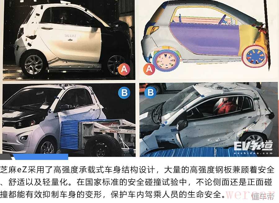 芝麻eZ采用了高强度承载式车身结构设计,大量的高强度钢板兼顾着安全、舒适以及轻量化。在国家标准的安全碰撞试验中,不论侧面还是正面碰撞都能有效抑制车身的变形,保护车内驾乘人员的生命安全。不仅如此,芝麻eZ搭载的三元锂电池的电池PACK防尘防水等级达到了目前最高的IP67,并经过海水浸泡、低温火烧、碰撞挤压、短路、过充/放电等多种极端条件严苛测试,均未出现起火或爆炸现象。