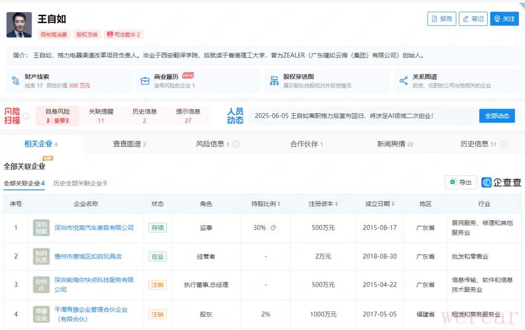 企查查信息显示,王自如名下关联4家企业,其中2家为存续状态,包括深圳市悦宸汽车美容有限公司等。值得注意的是,目前,王自如仍处于被限制高消费状态,申请人为上海曙晖创业投资中心(有限合伙)。案件流程信息显示,王自如已因此案被冻结150万股权。目前该案已成为终本案件,未履行金额为2878万余元。