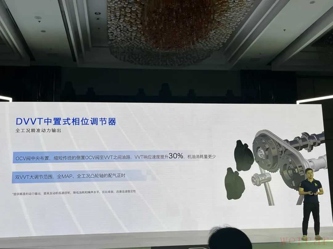 DVVT中置式相位调节器通过双VVT进行大调节范围,全MAP、全工况凸轮轴的配气正时,可提供更精准的动力输出,提高发动机低速扭矩。OCV阀中央布置,也使测置OCV阀和VVT之间油路缩短,VVT响应速度提升30%,机油消耗量更少。