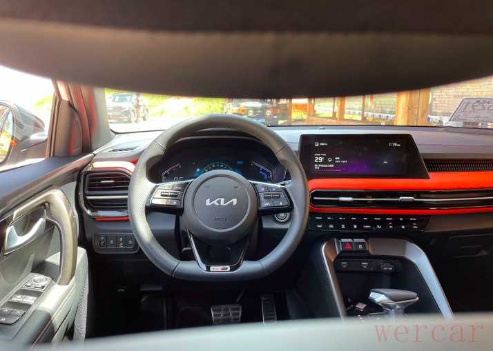 这台车的外观处于硬核与潮酷之间,这与起亚对这台车的定位相符。他们认为,30岁出头的男性一脚迈入了成熟稳重的男人阶段,另一只脚还停留在男孩的玩乐时代。因此,大量偏方正直白的线条与围绕车底一圈的橙色装饰条同时出现在这台车上。车侧与车尾点缀的GT-Line标识也展现了它是一台高功率1.5T车型的身份。