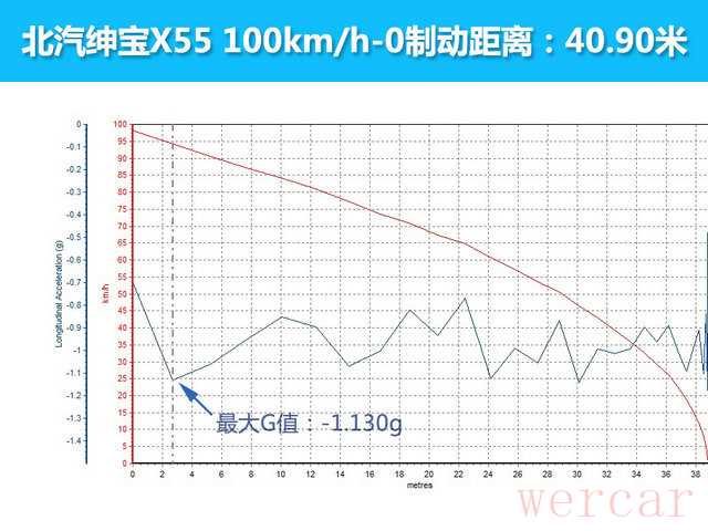 制动测试中,X55的前悬挂压缩并不明显,后悬挂拉伸范围也比较合理。最终测试成绩40.90m。