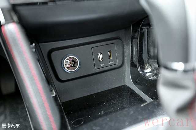 排挡杆前方储物空间布置有12V电源、USB与HDIM接口各一组。