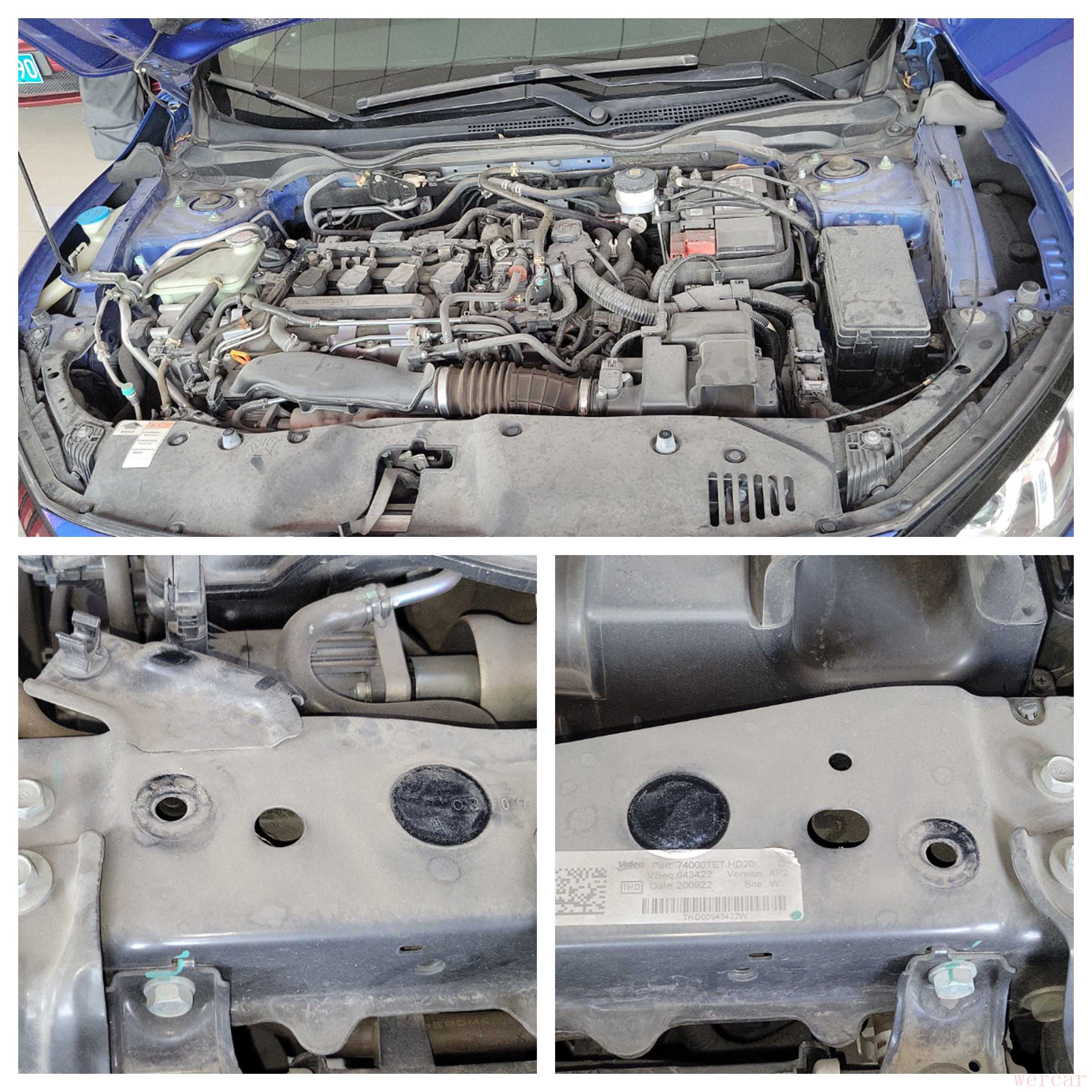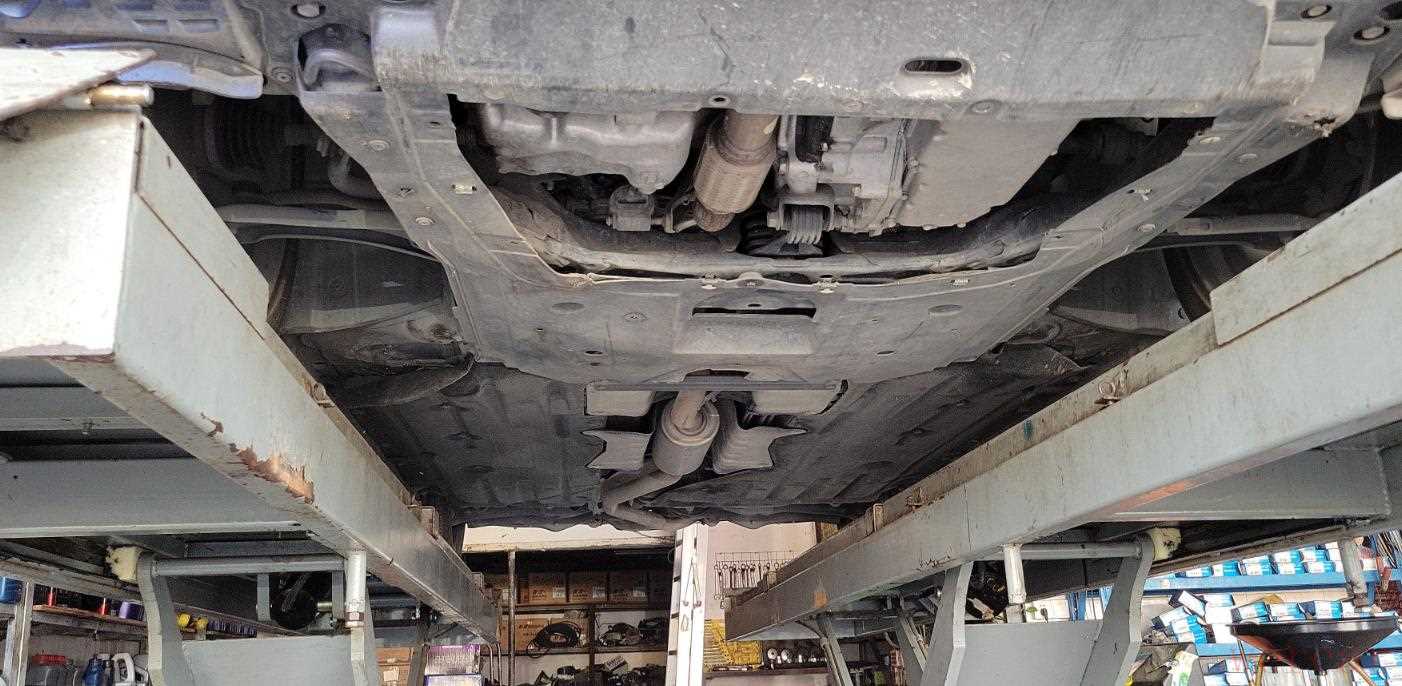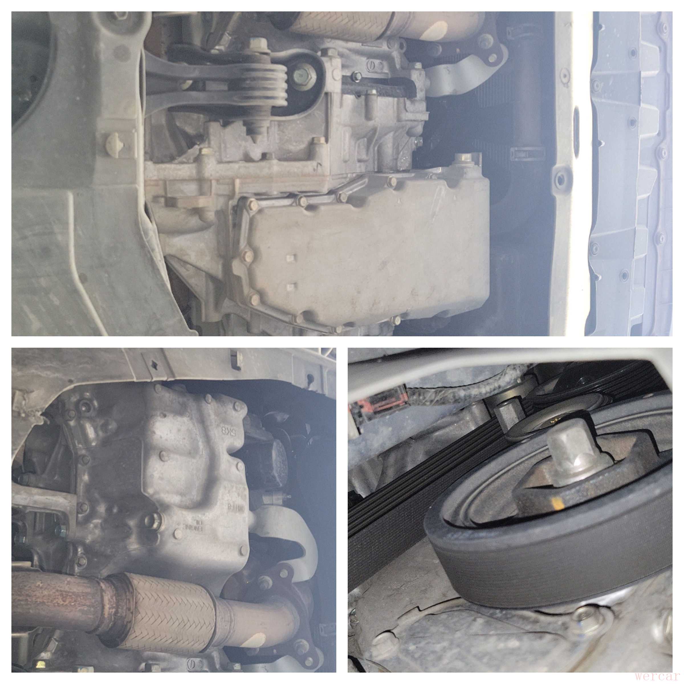 把车升起来了检查发动机变速箱底部,可以看到还是比较干爽的,没有渗油的情况。