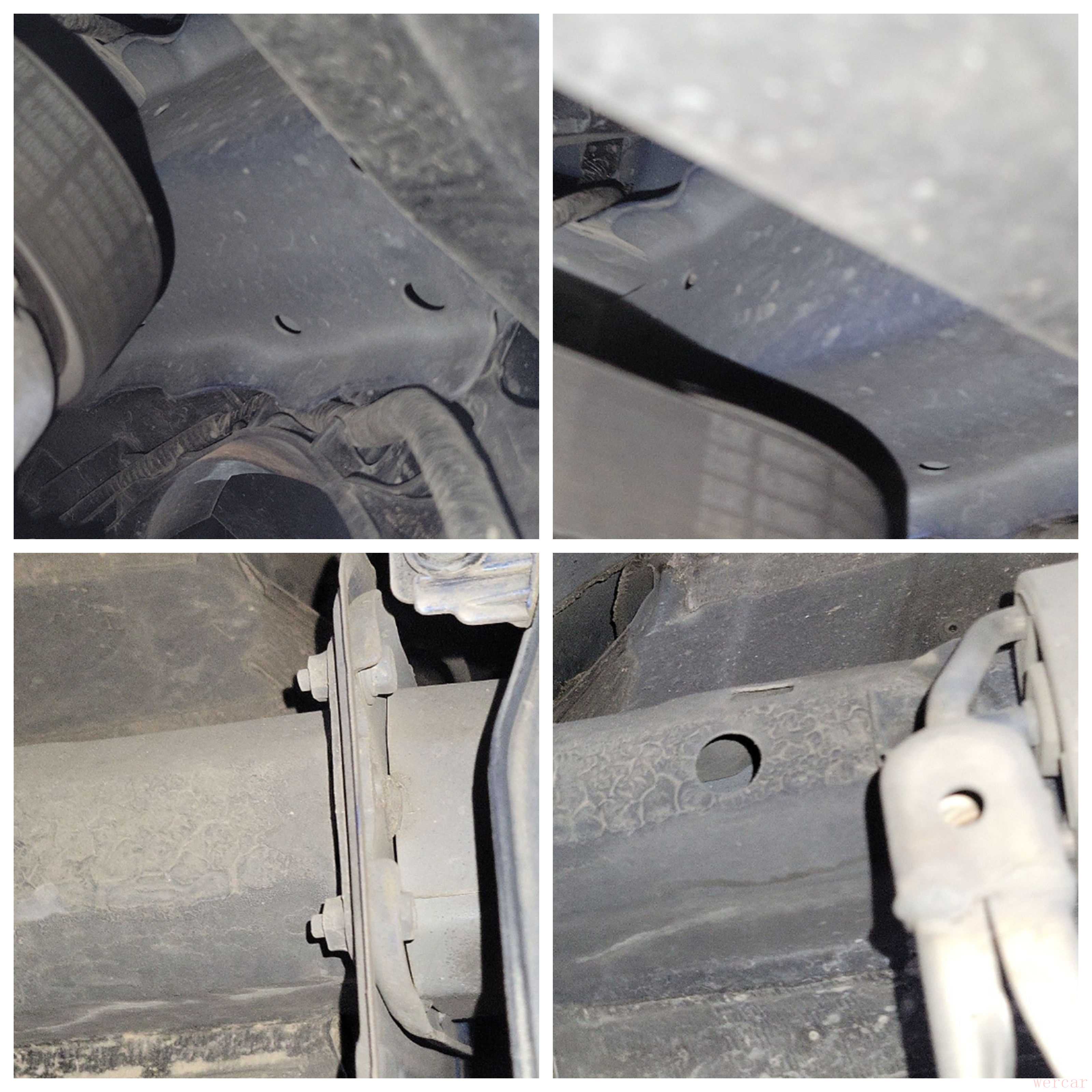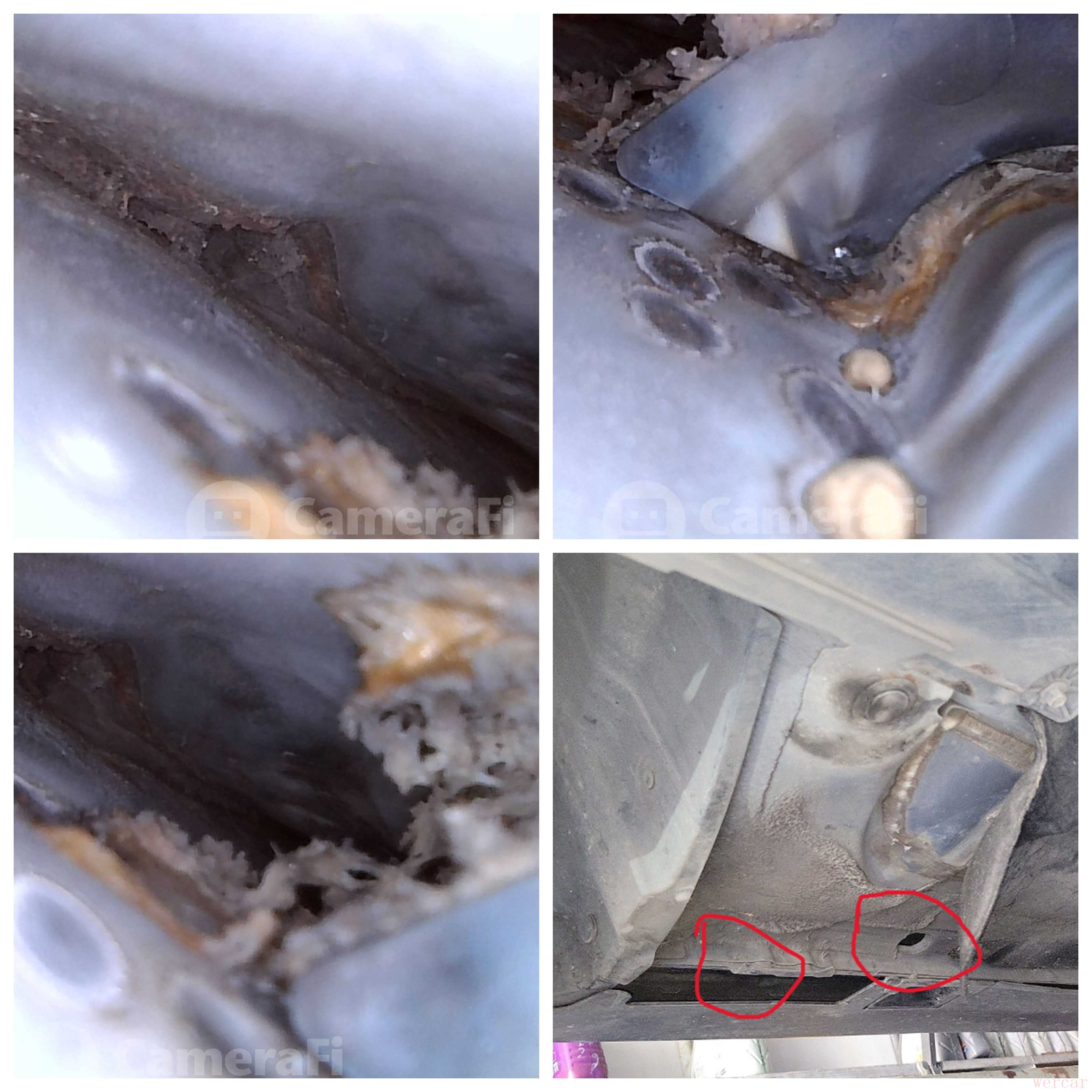 因为之前在上面看左C柱内侧的时候没有合适的地方伸内窥镜,所以现在从底盘下面的空洞伸内窥镜往里面看,通过内窥镜可以清晰的看到里面之前钣金修复的痕迹,而且里面还有变形,但确实是没有切割的。