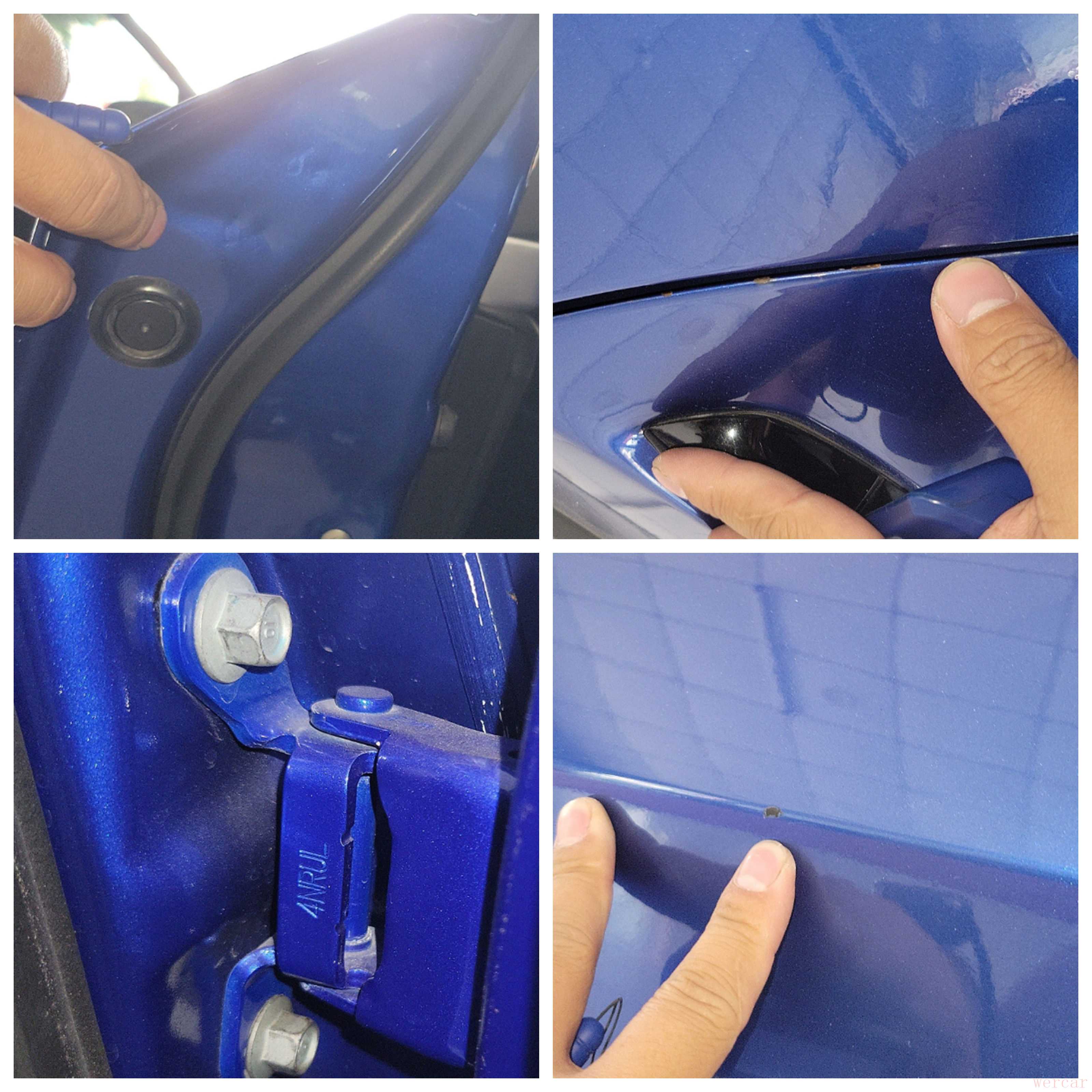 接下来检查到左后的车门也是更换了的,铰链的螺丝有拆卸痕迹,外观漆面也有一些瑕疵磕碰。