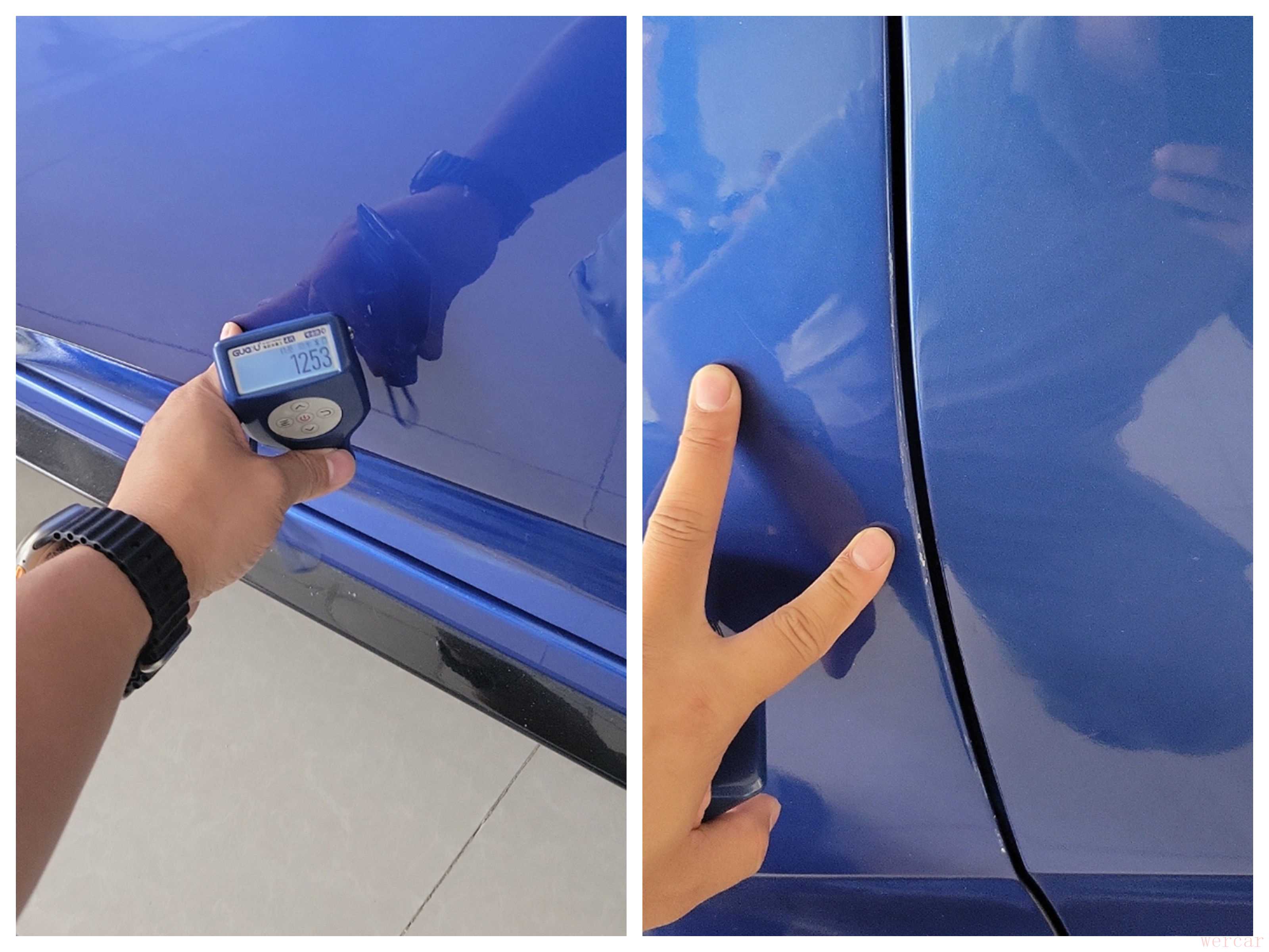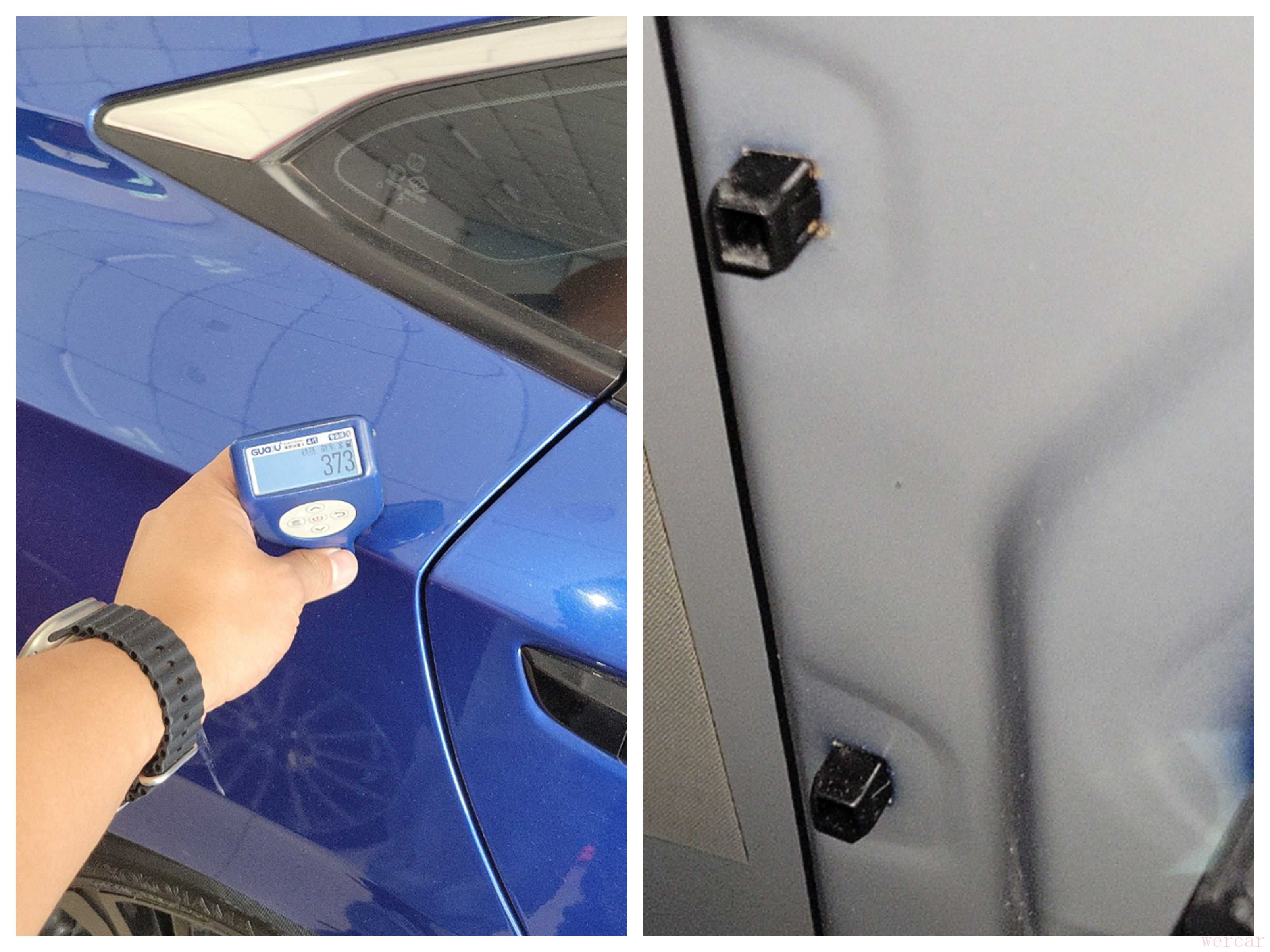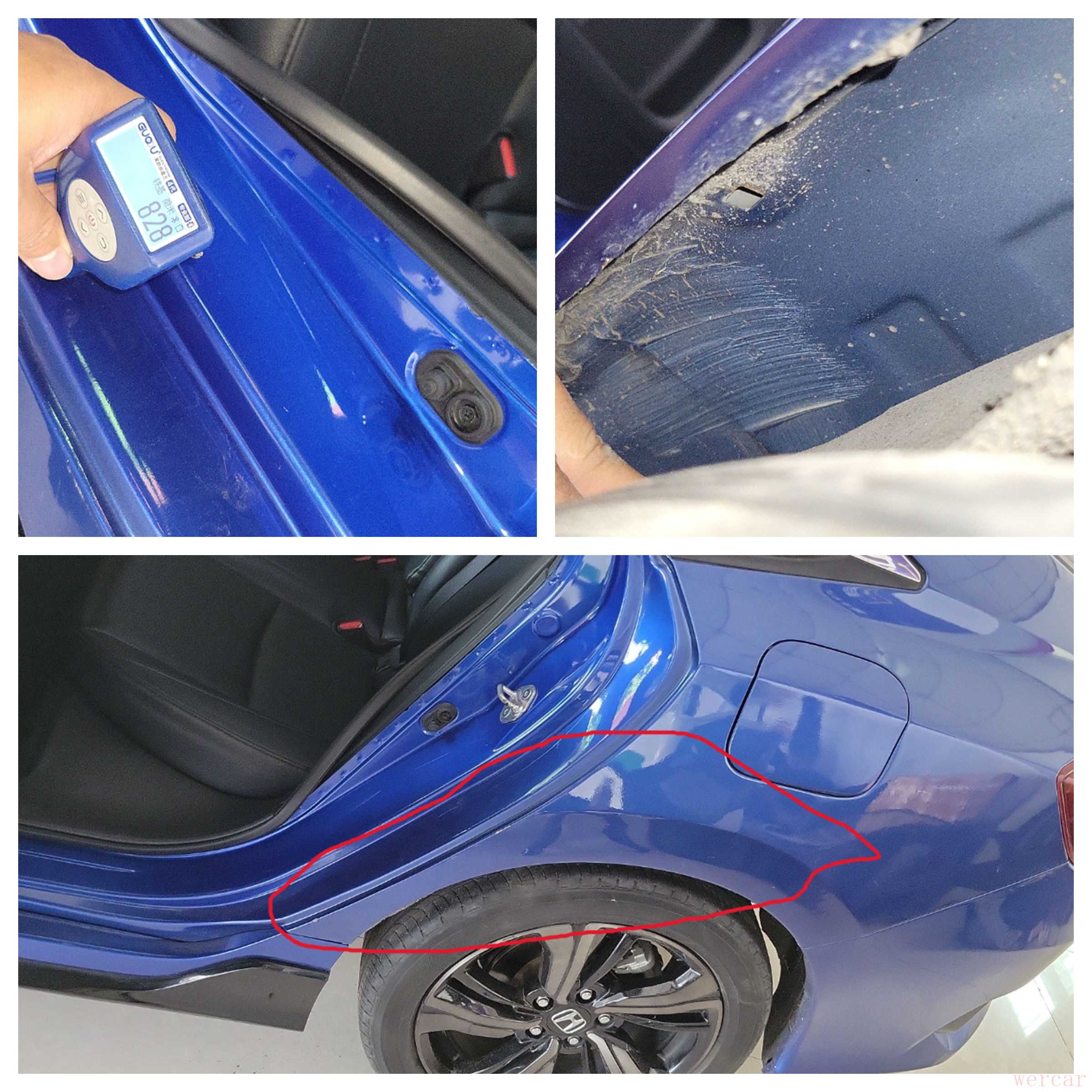 右后的翼子板有喷漆的情况,然后把翼子板内侧的内衬拆开看了,里面是没有问题,一般后面的翼子板不管有没有喷漆都要拆开看看里面有没有修复过的情况,之前遇到过外观的漆面没有问题, 但是翼子板内侧有局部切割焊接的情况,所以千万要仔细地按照流程检测,不能漏检。