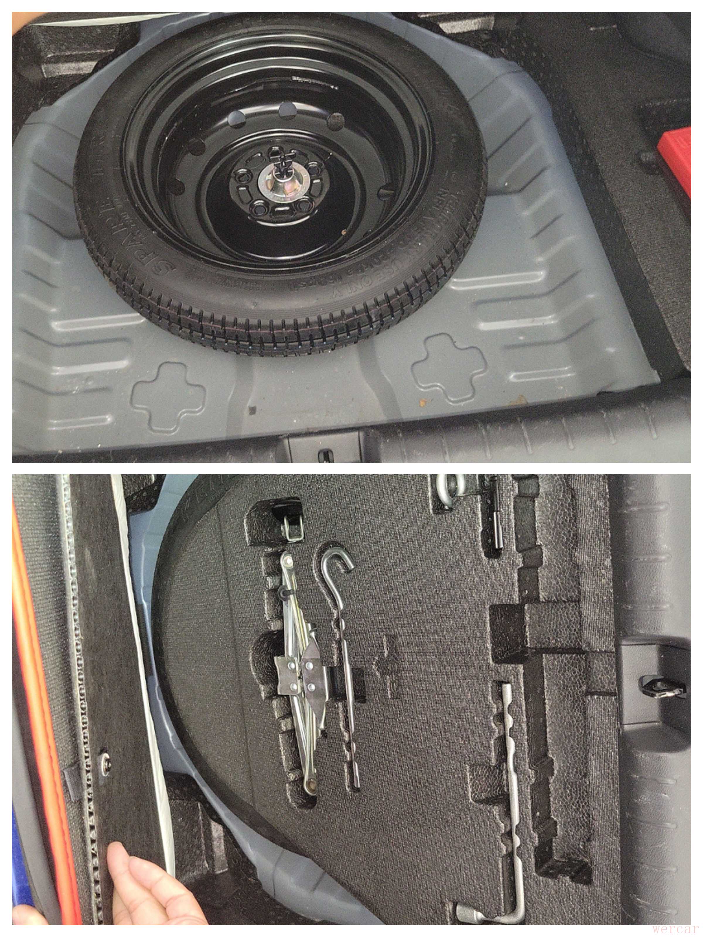 后备箱底下是比较干爽的,没有追尾修复的情况,随车工具也齐全, 看备胎都没有使用过。