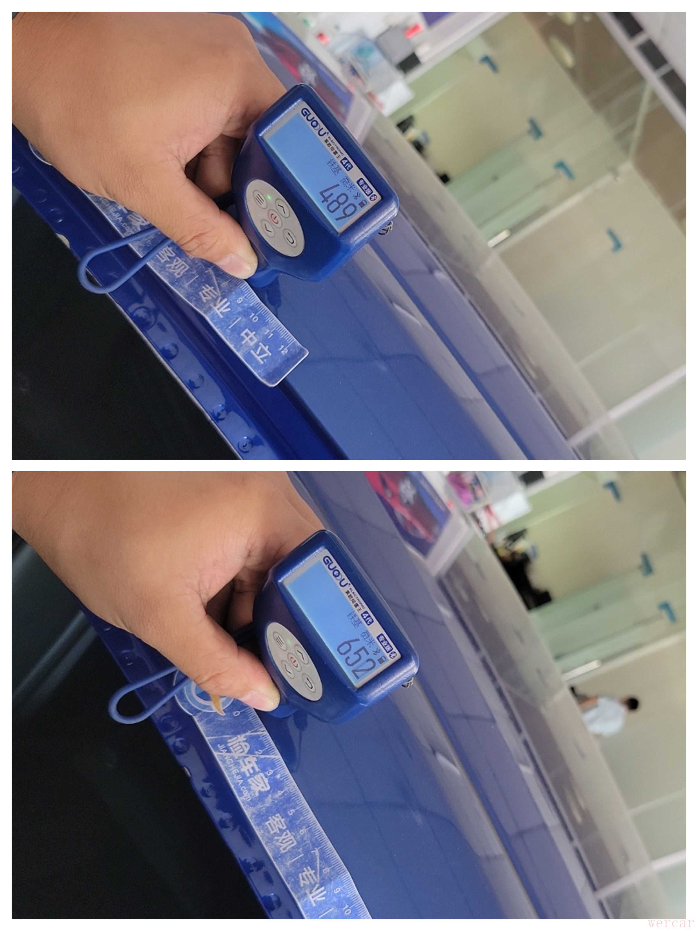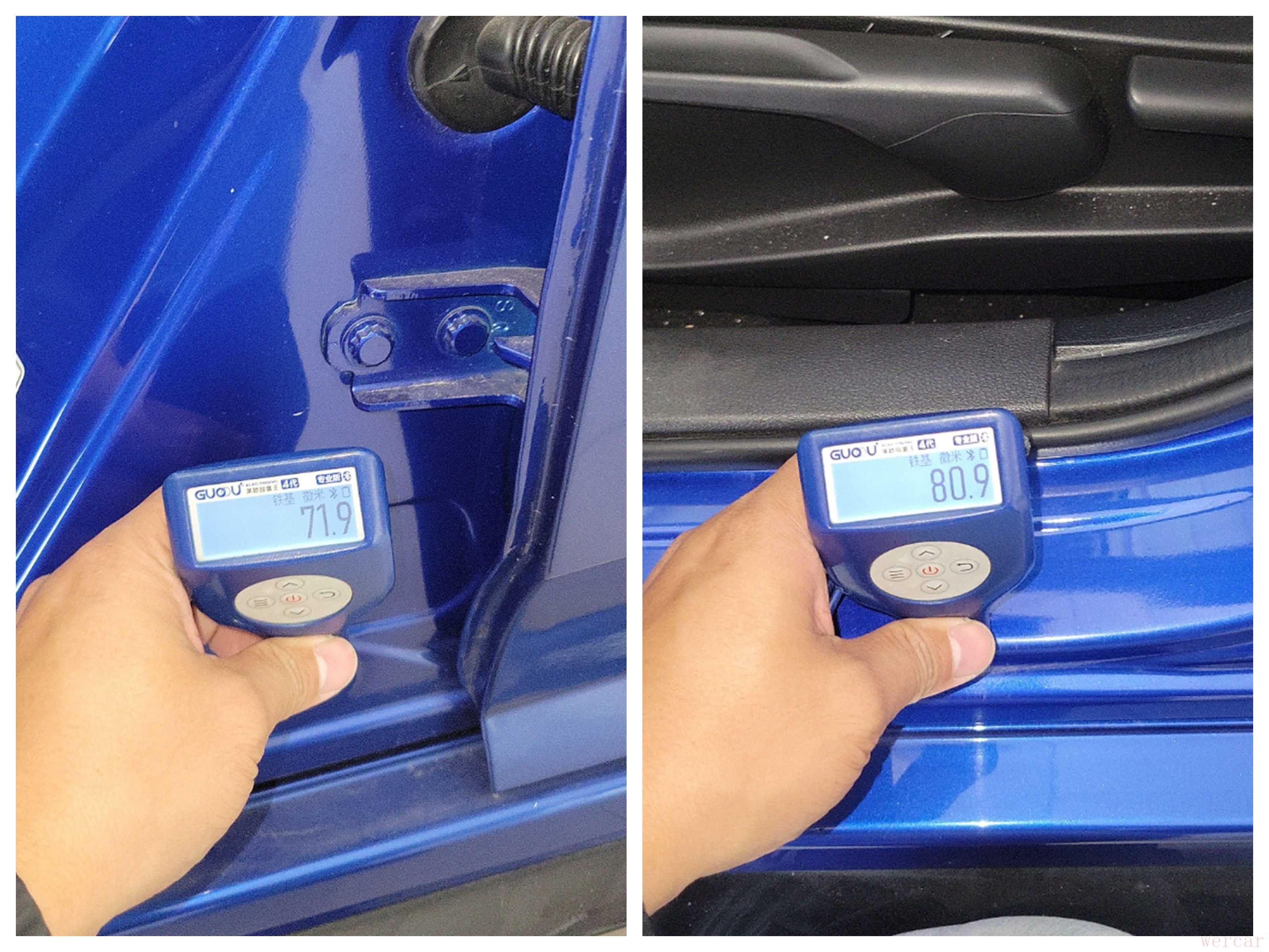 检测左前车门发现上面的数值明显有钣金修复的情况,车门边缘也有比较多磕碰的痕迹。