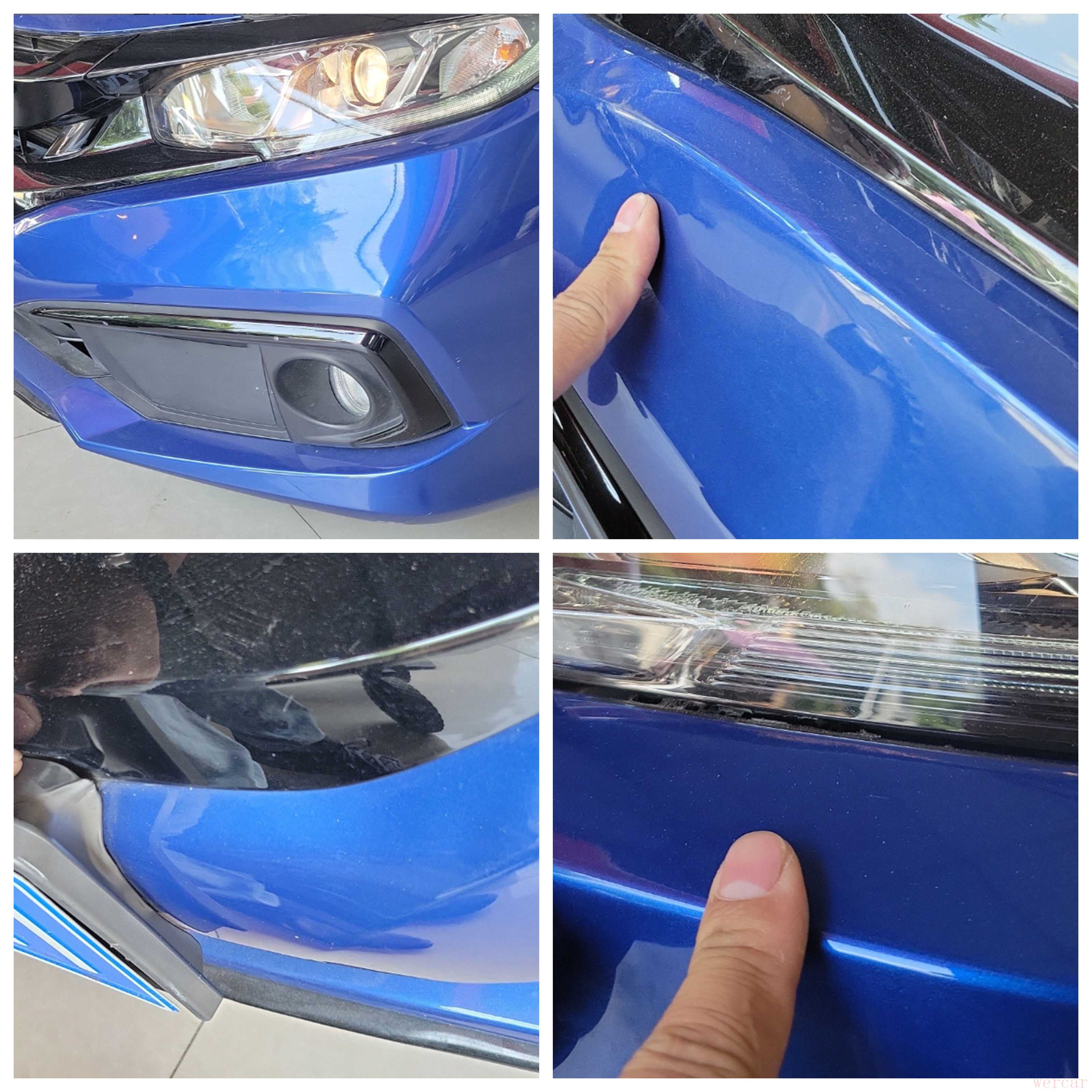 首先前杠可以看到表面有明显顶撞过的痕迹,漆面有明显的变形,还有牌照架也有破裂的情况。看来前面有过碰撞,就要看严不严重了。