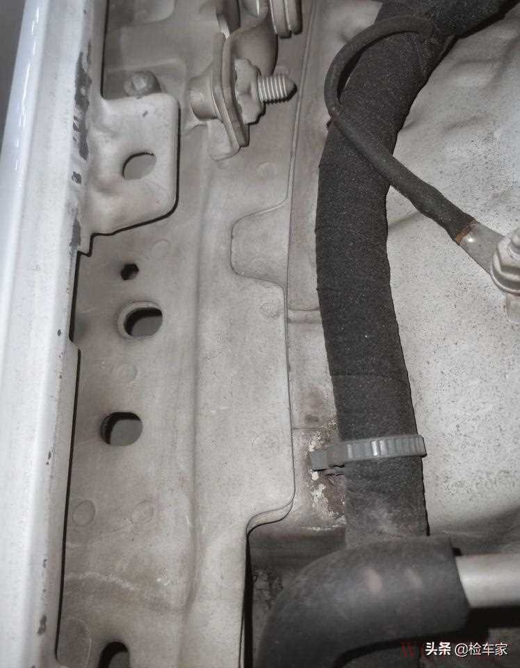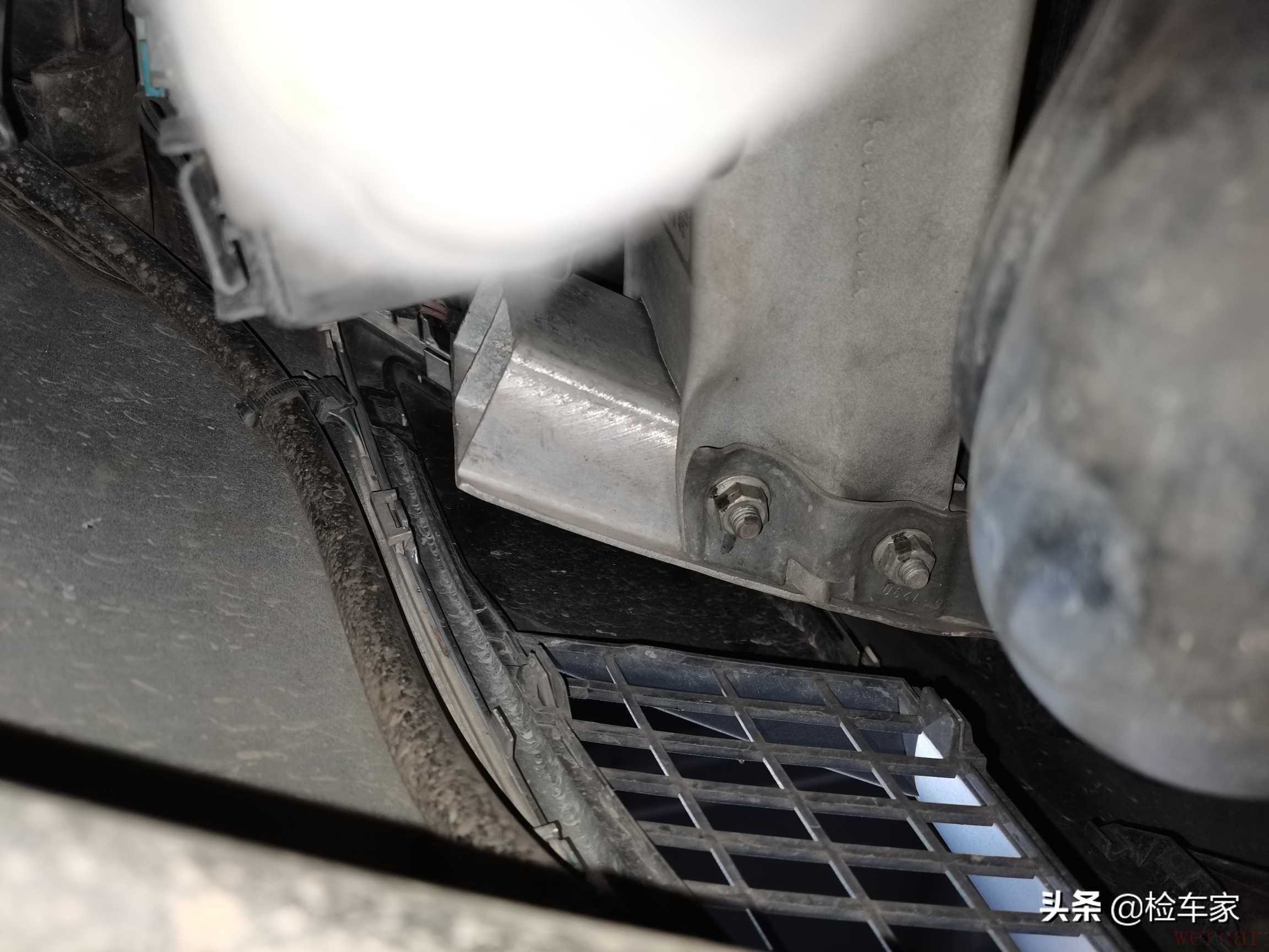 右前叶子板螺丝如实有拆卸,不过叶子板骨架没有变形褶皱,表面无钣金切割修复,下面的右前纵梁也是一切正常,看来右前部位并没有严重的撞击事故,只是伤到了叶子板,未伤及内侧骨架。