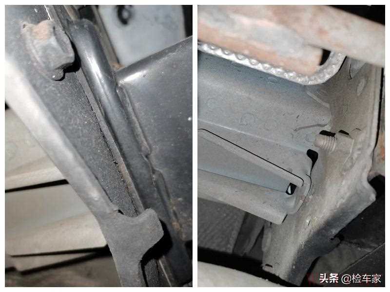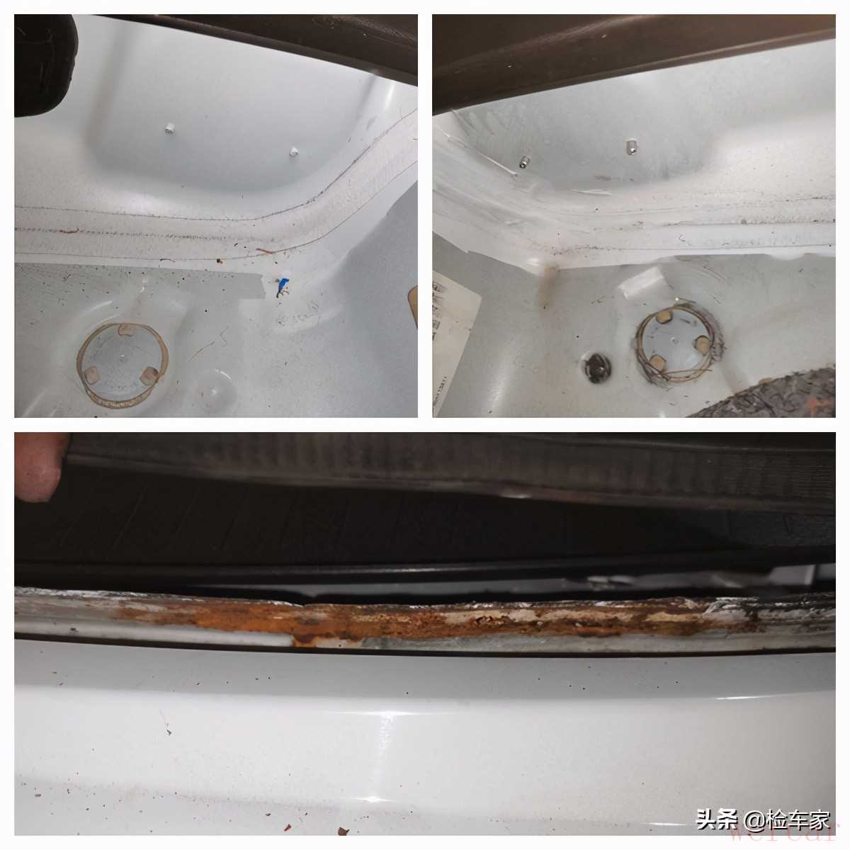 依次查看备胎槽,后围板。哇!果然是中奖了,后围板与底板结合处,左右两侧打胶形成了鲜明对比,而且封边位置因为密封不严都生锈了。车辆右后方被追尾过,伤及后围板,更换了后尾门,后尾灯,后保险杠。修车的时候,后防撞梁肯定也有所损伤,待会我们举升看底盘时再确认一下。