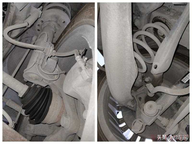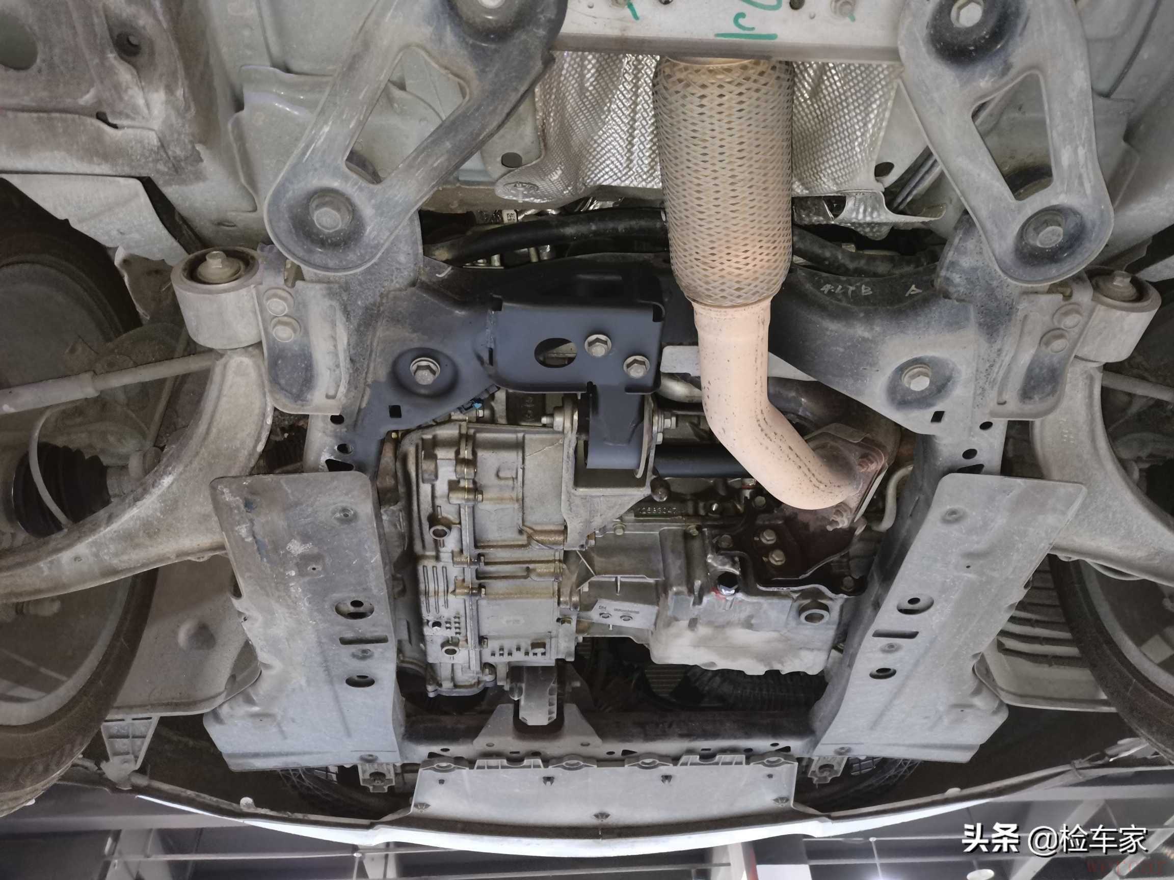 继续下一步,用举升机将车辆举高高,底盘还算规整,前麦弗逊后多连杆的悬架没有什么新意,隐约看到发动机底部漏油的迹象。