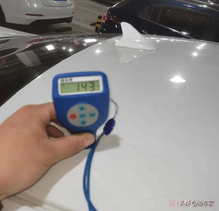 还是从外观漆面开始检测,首发一击车顶部位,143μm的车漆厚度,还不错,多测了几个点位,肉眼仔细观察车顶表面没有褶皱和沙眼,就可以拿这个车顶的漆面厚度作为基准参考。