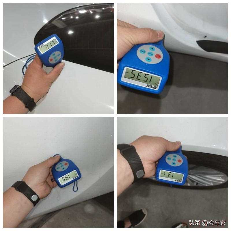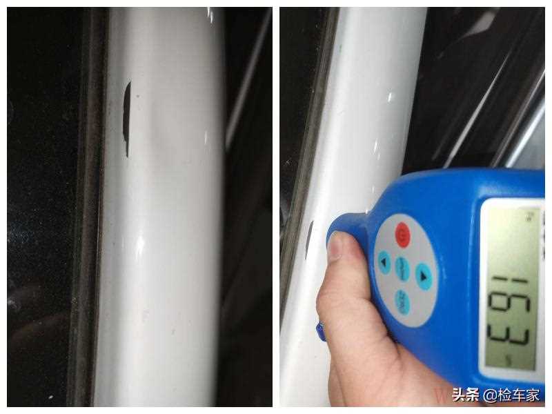 接着向后看,机盖和左前叶子板、左前门都是原车漆,但是左A柱发现了问题,上面有一处细长的掉漆现象,长度不到2厘米,而且表面凹陷变形,估计是撞到了什么东西。用漆膜仪测了一下车漆,厚度数据并没有问题,估计原车主觉得不影响使用就没管它。但是按照国标和我们检车家的二手车鉴定标准,A柱事故受损应判定为事故车。