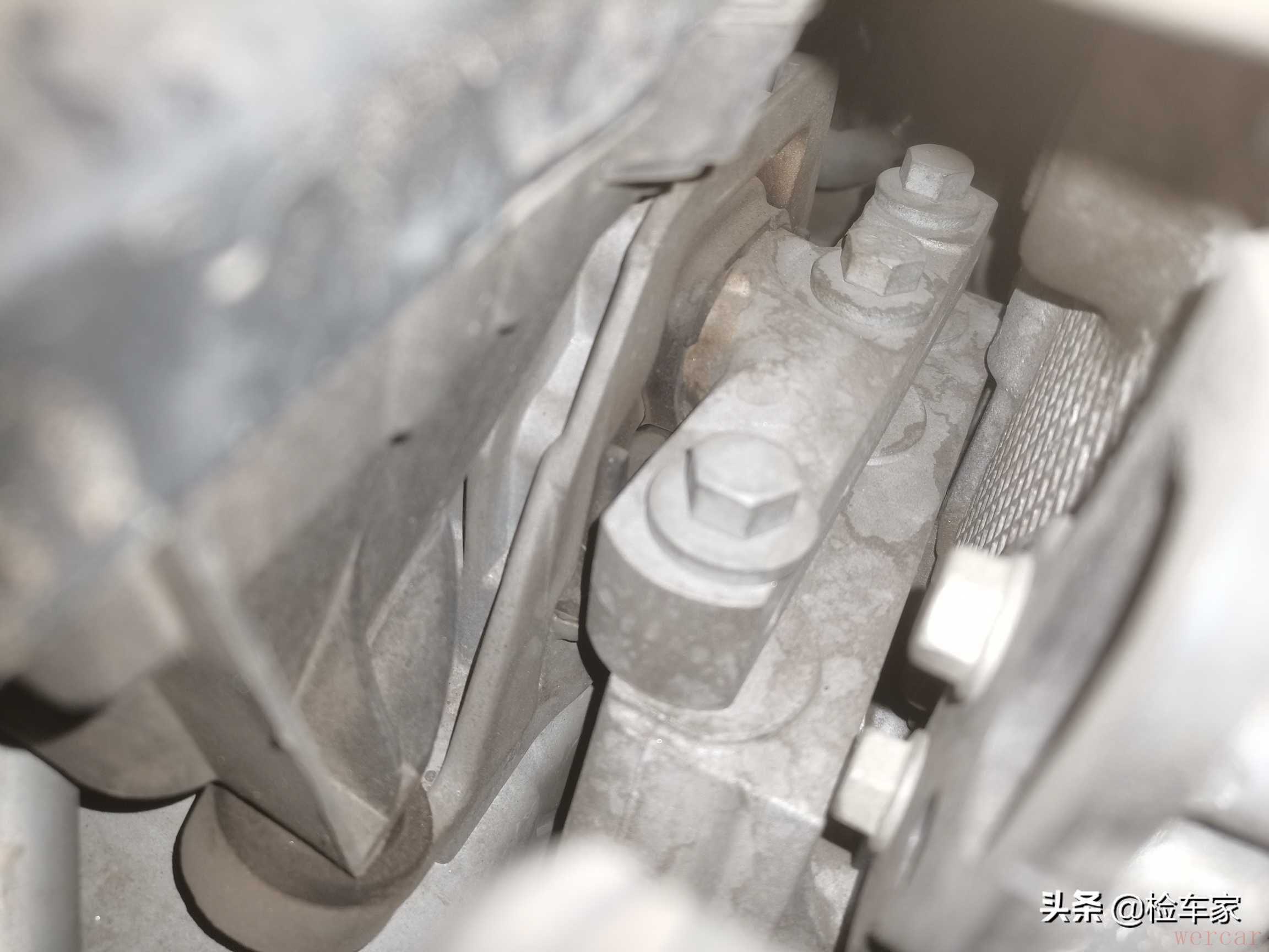 发动机部位,先检查的当然是连接发动机与车身的固定螺丝,俗称棘爪,棘爪还起到一个过滤震动共振的作用。所以说要是想要吊装发动机或者变速箱的话,棘爪就是必须要拆的。仔细观察棘爪螺丝没有发现双向受力的拧动痕迹,也就排除了发动机吊装的可能。不过由于年限的原因,棘爪出现了下沉老化的现象,这样的话就需要后期进行一个更换。