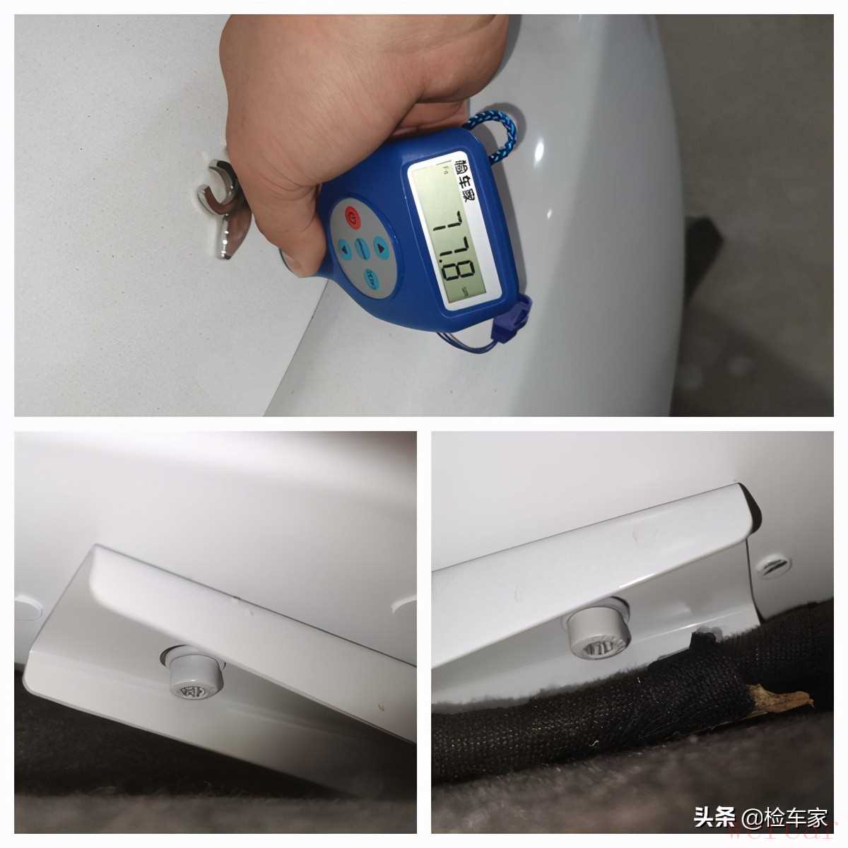 车身左侧其他部位没有大碍,来到车尾门处,用漆膜仪测量后,发现尾门有的位置漆面70-80μm,远低于正常基准值。这时我们就要提高警惕了,一般数据低于参考值过多,那么这个尾门就很有可能更换过。为证实猜想,我打开了后尾门,果然,后尾门两侧螺丝都有拆卸痕迹,附件也都动过。
