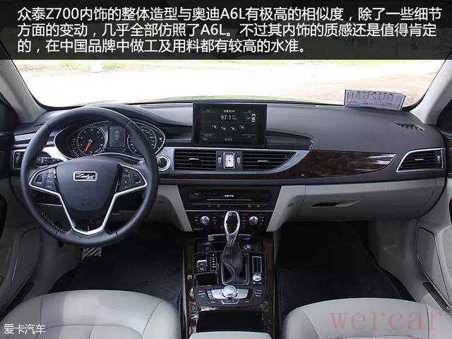 众泰Z700的内饰照搬了不少A6L的设计,无论是内饰造型还是功能布局都与A6L如出一辙。但在质感方面众泰还是比较下功夫的,起码在中国品牌中制作工艺及用料都能够有较高的水准。Z700的配置也是非常全面且丰富的,其中不乏一些在高端车中才能见到的配置,而且许多都是全系标配。