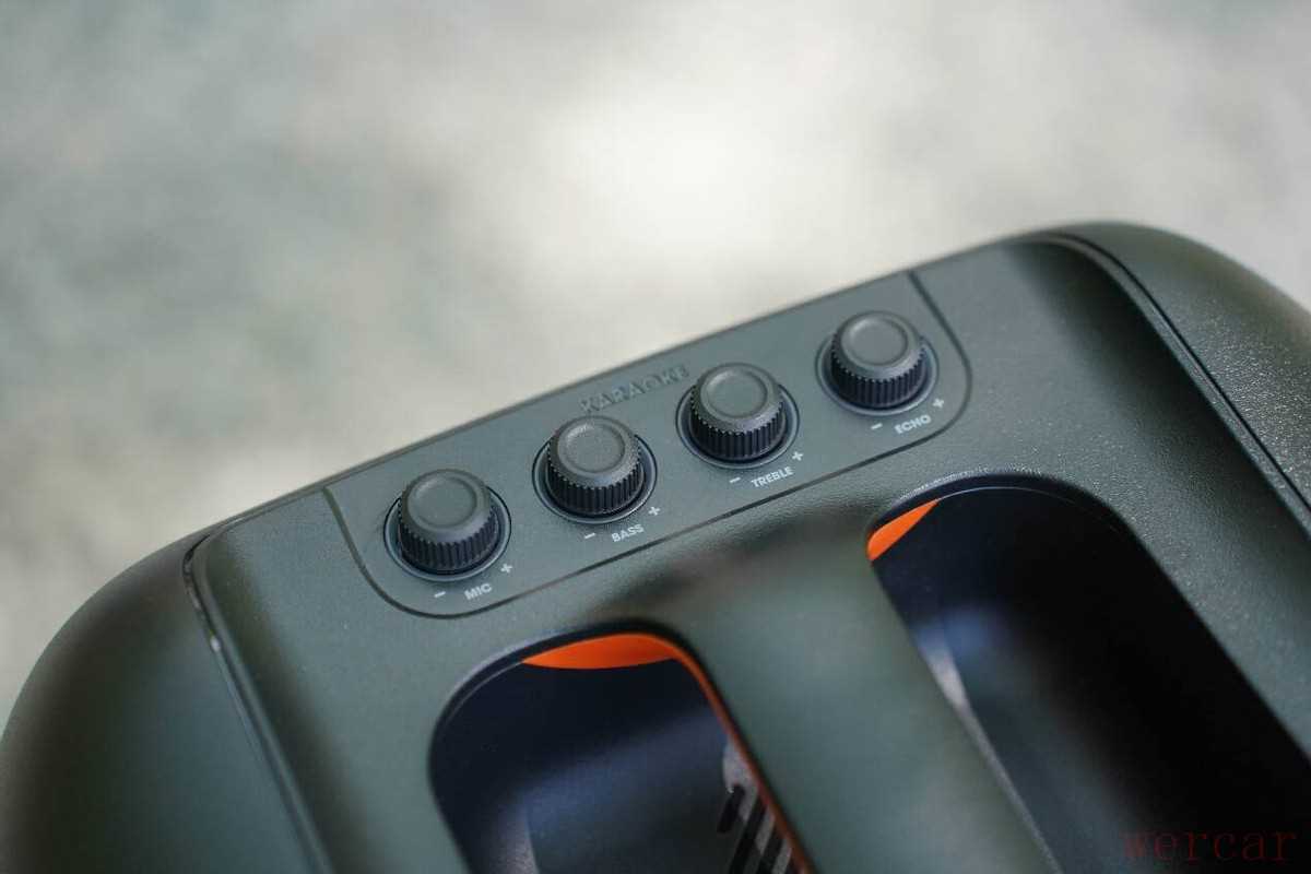 在顶部的另一端还看到了四个旋钮,这四个旋钮是用来单独控制数字麦克风的,所以这几个按钮也是欢唱版独有的功能,这几个按钮的功能分别为音量控制、低音高音调节以及回声音效调节,经常唱K的小伙伴对这几个不会陌生吧。
