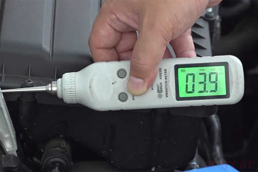 测试方法:水温正常后,关掉空调,在怠速状态下,使用测振仪垂直曲轴方向,将探针接触发动机金属机体中间的最高位置,测量发动机振动加速度值,数值越低,表明振动越小。