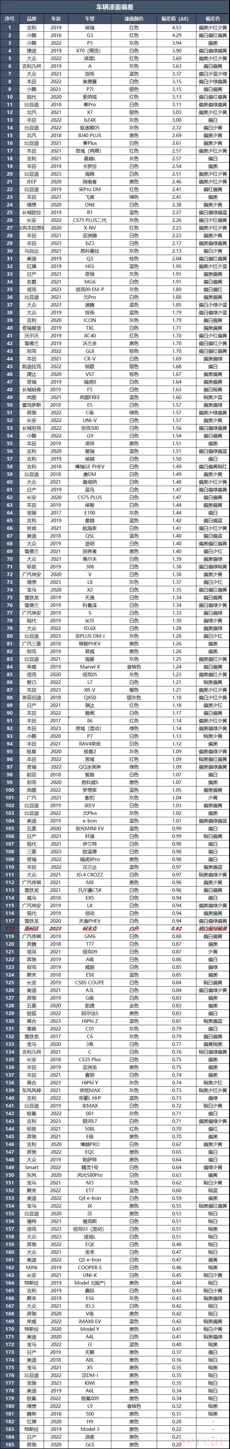经过测试,最大色差值位于保险杠处,色差值为0.92ΔE,比基准点稍白偏绿偏黄。从数值上来看,这辆车的喷漆工艺质量控制得还不错。