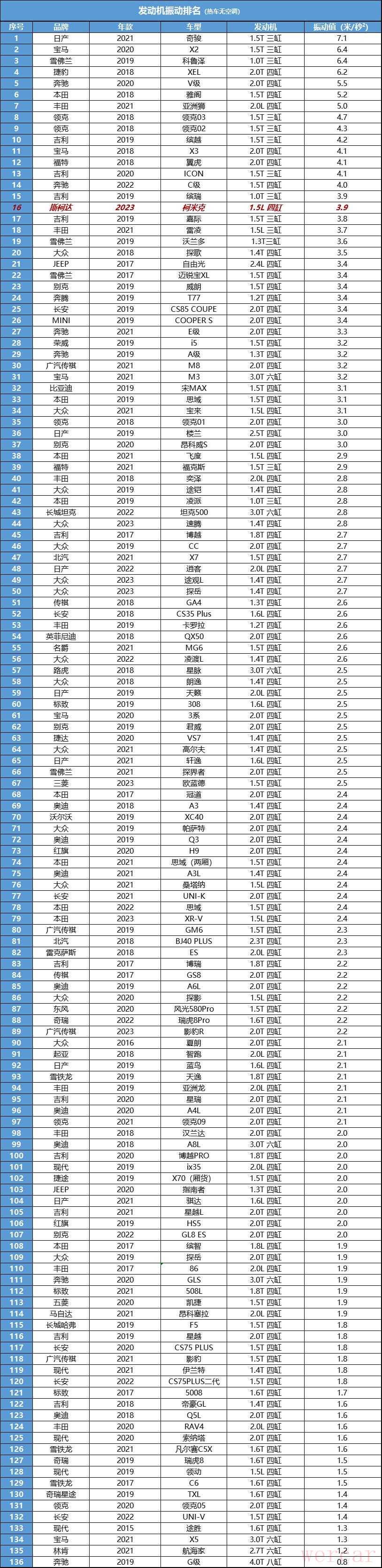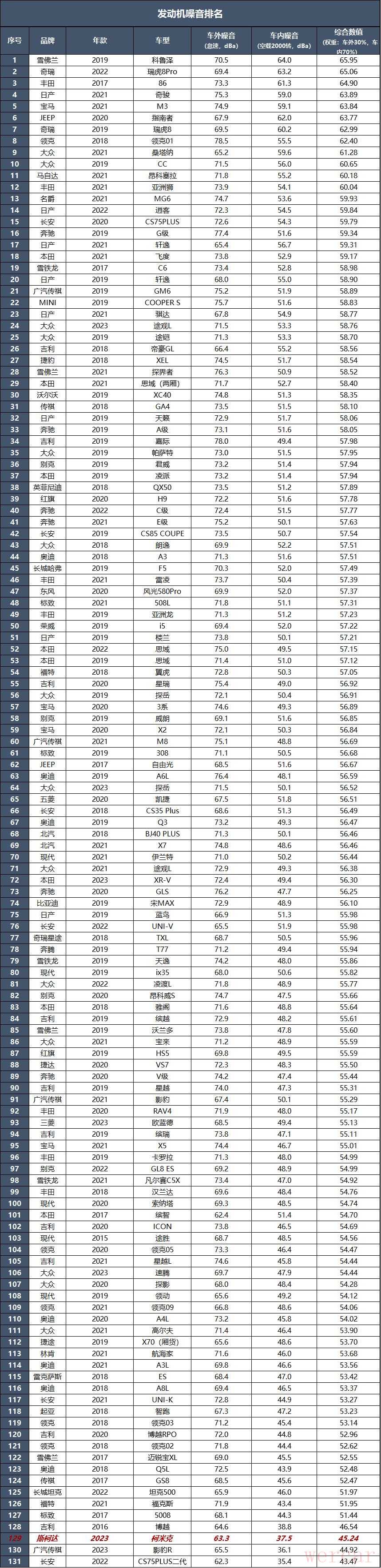 测试方法:发动机完全热机,水温正常,关闭空调,正常怠速下进行测试;打开发动机盖、取下引擎罩,在距离发动机机体上方20厘米处,进行噪音采集,取平均值,为车外发动机噪音数值(dBa);在车内,将车窗关闭,发动机空载运转2000转/分,将噪音仪置于方向盘正上方,取平均值,为车内发动机噪音(dBa)数值。并且以车内30%,车外70%的权重进行综合计算。