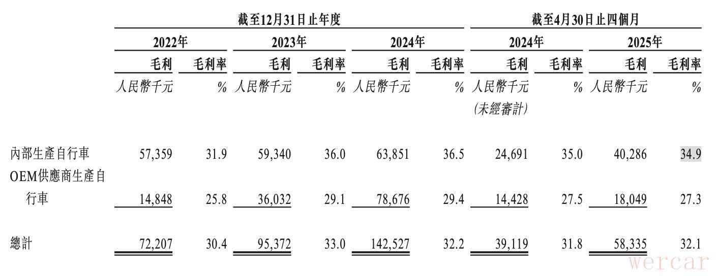 与此同时,公司代工生产比例持续上升。招股书显示,2022年、2023年及2024年及2025年前四个月,大行科工由OEM供应商生产的自行车分别有4.4万辆、7.65万辆、13.67万辆及6.6万辆,分别占总数约29.5%、45.1%、56.8%及65.5%。也就是说,今年前四个月,大行科工有超过6成产品来自代工生产。