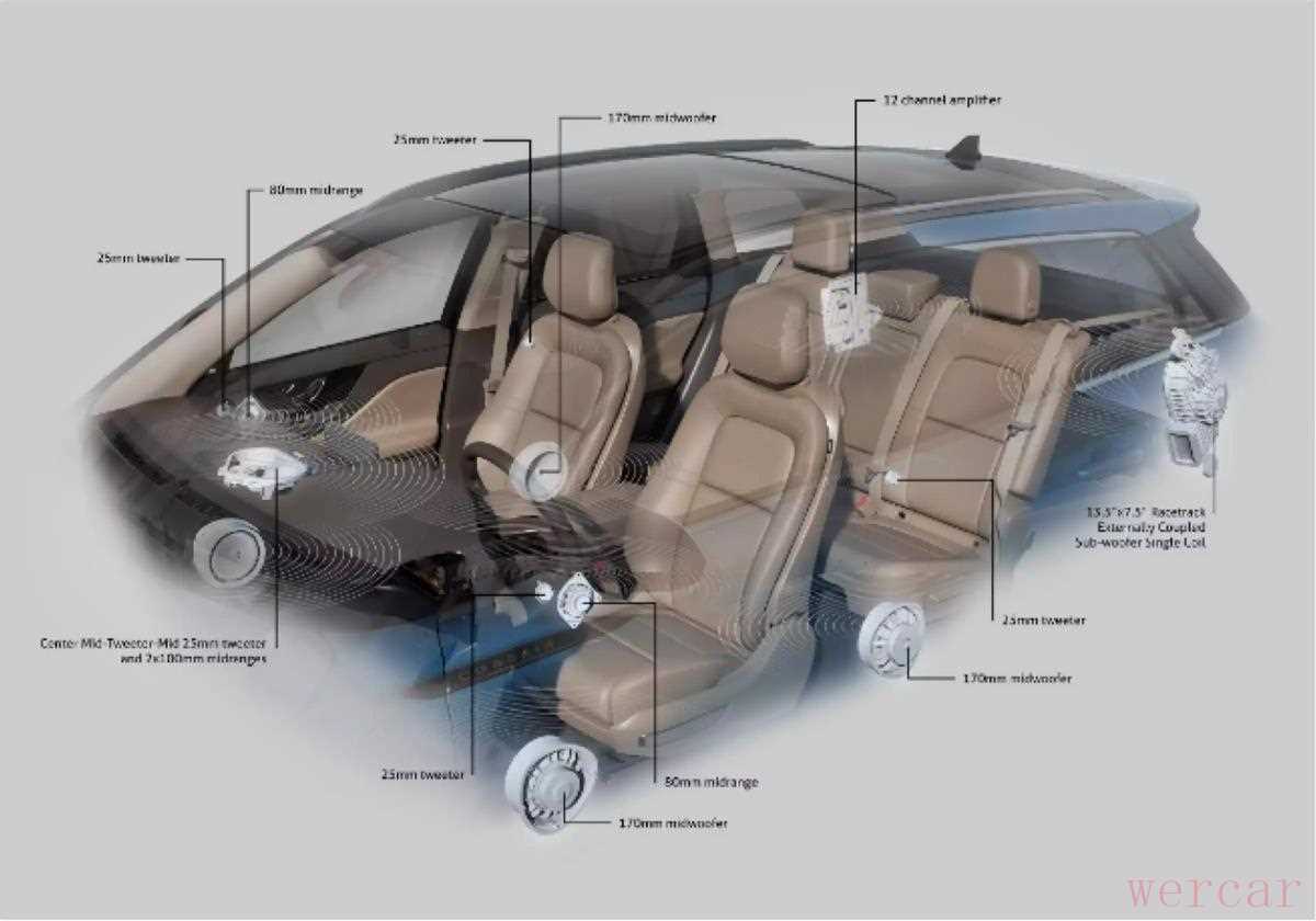 DS这牌子你可以觉得它不行(销量好像确实不行),但是DS品牌标志性的劲浪音响,特别是DS9歌剧院版的劲浪,你很难说它不行。DS9歌剧院版的劲浪音响一共有14个扬声器,车门4个中/低音扬声器、中控台1个中置扬声器、后视镜和后门共4个高音扬声器、后备厢有1部低音炮、剩下的4个是卫星音响,2个高音2个中音,空间布局合理,有助于营造声音的空间感,前后排乘客的聆听体验都不错。
