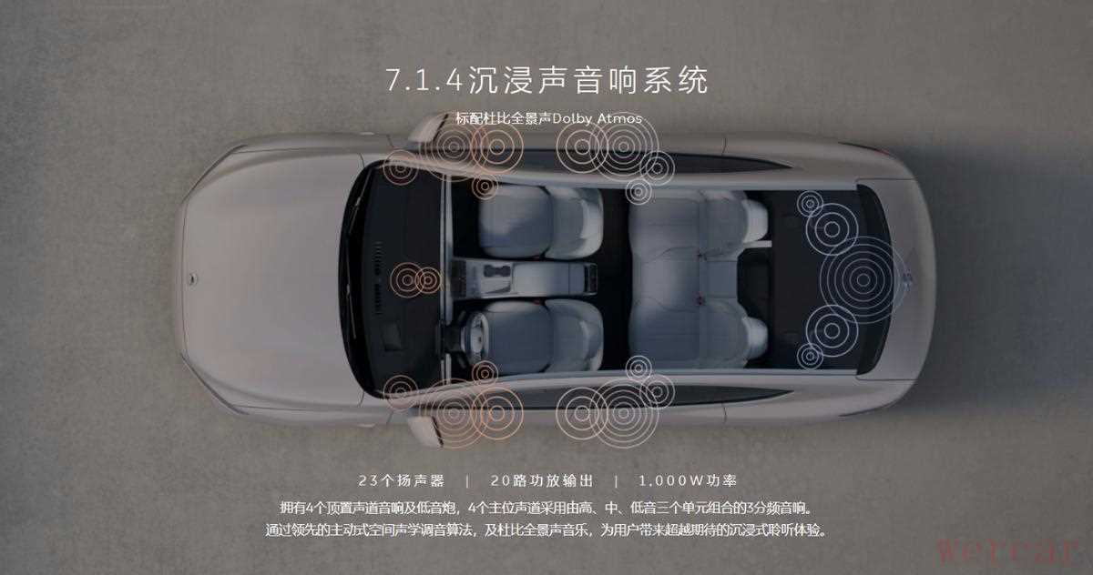 蔚来ET7没有选用国际知名的车载音响品牌,但是ET7的音响采用了杜比全景声技术,去过杜比影院的朋友应该都感受过杜比全景声的魅力,那真的是木耳都能听出来高下。扬声器方面,蔚来ET7配备了23个扬声器,有效功率1000W,其中有4个顶置式扬声器,感受过小鹏P7顶置式丹拿音响的小编认为23扬声器的ET7表现应该会更好,空间环绕效果无疑要更上一个台阶,建议去感受一下蔚来ET7版的《送别》。