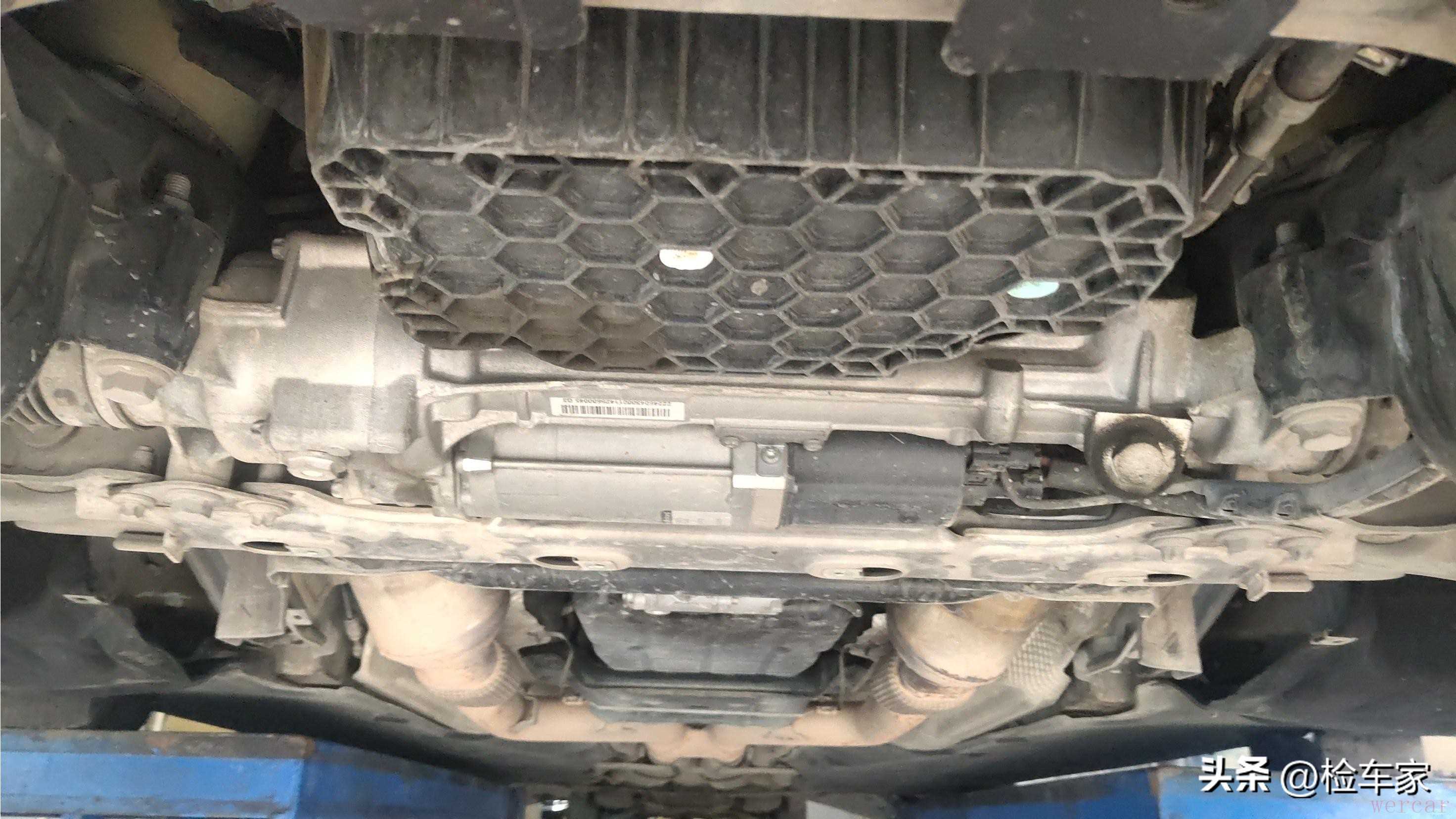 第四步,进行最后一项底盘检测。从这个全景图可以看到,发动机和变速箱下面还是比较干净的,并没有看到明显的漏油现象,具体细节我们慢慢看。