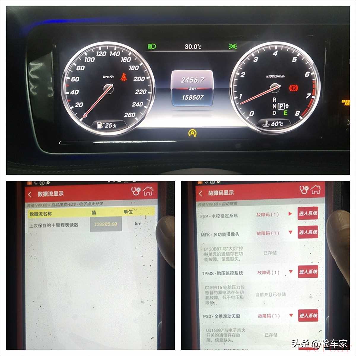 接着用OBD读取车辆的故障码及公里数,能看到电脑公里数和表显里程是一致的,结合内饰和轮胎刹车盘的磨损程度,英俊判断车辆不存在调表的情况!电脑故障码虽然比较多,但都是跟车身电器设备相关的,而且很多都是电瓶电压低导致的,问题不大,清除掉即可!