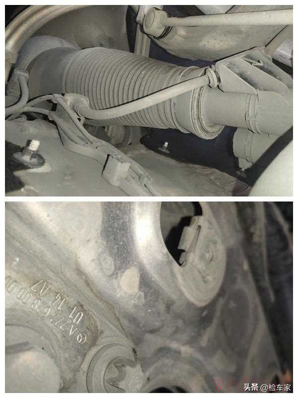 往下看纵梁,因为前面有外观件的改装,英俊担心是事故损坏顺带的改装,结构件不能掉以轻心!还好两个前纵是完好的,没有任何变形扭曲钣金切割维修痕迹!