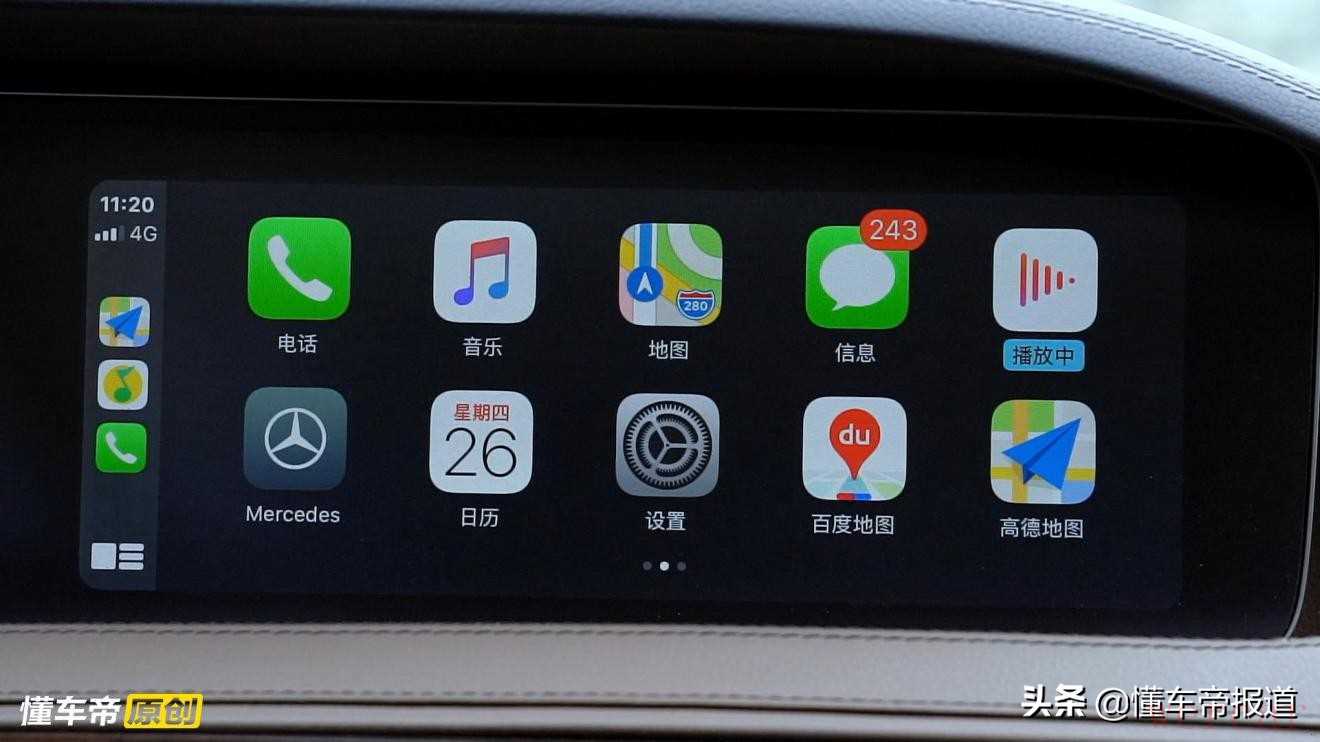 不过,这台奔驰S320L跟我们前段时间测试的GLB不同,它是支持CarPlay以及CarLife的,基础的导航、听歌等需求都是可以满足的,只是由于车机本身不支持触屏,用起来可能没有那么方便且直观。