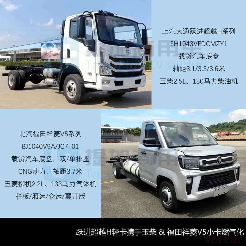 - 上汽大通本批携手玉柴,申报了轻卡平台的跃进超越H系列SH1043VEDCMZY1载货汽车底盘,准乘2/3人,轴距3.1/3.3/3.6米,可选两组板簧悬挂,后双胎驱动、7.00吋轮胎,匹配玉柴2.5L、180马力柴油机。此处应留意,该新品是大通轻卡在国六时代首次与玉柴合作,而二者曾在国五时期的4吨自卸工程领域有过牵手,并上延到10/12吨“大轻卡”和16/18/24/25吨重卡范畴。鉴于本批同系的SH3043VEDCMZDY自卸汽车底盘亦扩展了玉柴同款动力方案,并在SH3043VEDCMZD1自卸式货车上唯一选用(后单胎、7.00吋或245号),可大致感知产品应用范围。