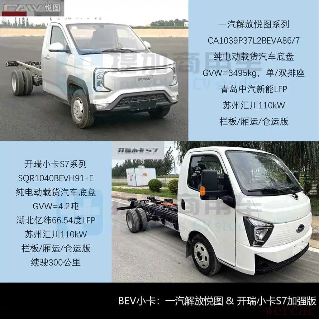 - 奇瑞商用车本批申报了开瑞小卡S7系列SQR1040BEVH91-E纯电动载货汽车底盘,以及栏板/厢运/仓运版整车,采用与飞碟谛途同款的产品资源,属加强型小卡范畴。该新品GVW=4.2吨,车宽1910mm、准乘2人,轴距3.3米,可选两组板簧悬挂,后双胎驱动、185号轮胎,搭载湖北亿纬66.54度LFP动力电池、车架内侧底置方案,苏州汇川110kW驱动系统,以厢运版为例,形成整车后箱长3990/4010mm、额载1795kg,续驶300公里。对“白车身输出大户”之一的奇瑞商用车而言,选用行业成熟资源、适度发展空白产品也是一种全新尝试,对大部分车企而言同样具有参考意义。