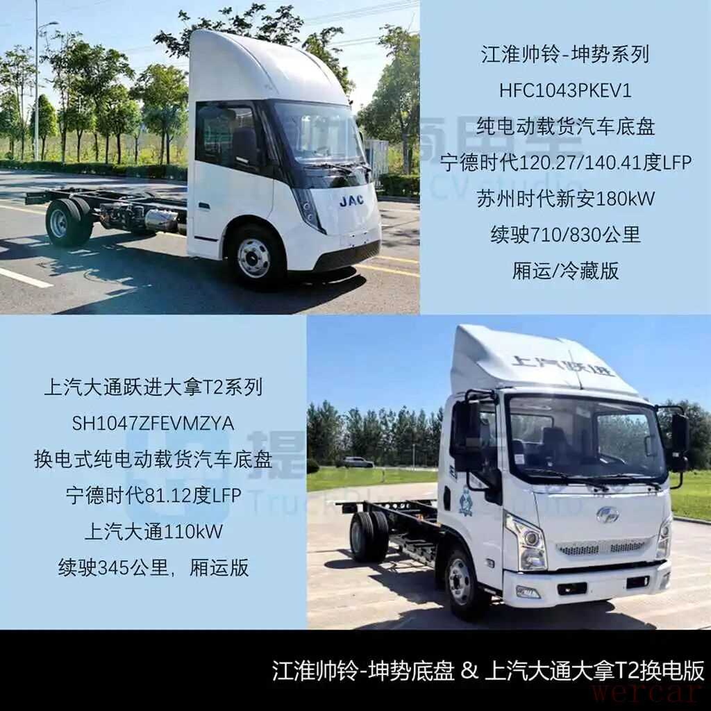 - 上汽大通本批申报了两款采用BSEV路线的轻卡新品,即大拿T1系列SH1047ZFEVMZY9和大拿T2系列SH1047ZFEVMZYA两款换电式纯电动载货汽车底盘,以及厢运版整车,分别与燃油版的跃进超越H系和C系相对应。前者车宽2125mm、准乘2/3人,轴距3360mm,前3片、后3+3片板簧,搭载宁德时代82.43度LFP动力电池,上汽大通140kW驱动系统(TZ210XS105型),形成整车后箱长4.17米、额载980-1145kg,续驶475公里。后者车宽1925mm、准乘2/3人,轴距同上,前3片、后3+2板簧,搭载宁德时代81.12度LFP动力电池,上汽大通110kW驱动系统(QT35TZ180RCB型),形成整车后箱长同上、额载1350-1680kg,续驶345公里——以上两款新品也是大通在换电轻卡领域的最新尝试,上次有相关新品申报还是去年6月期第384批公示的SH1047MFEVMZY4。