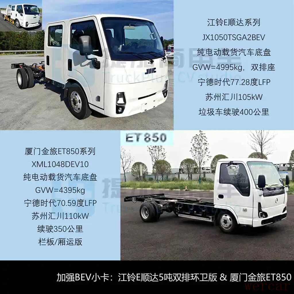 本月期出现了两款加强型BEV小卡新品,各有特点:- 首款为江铃针对市政环卫定制开发的E顺达系列JX1050TSGA2BEV纯电动载货汽车底盘,以及自卸式垃圾车。该新品车宽1880mm,根据前/后轮距1495/1470mm可知依然为小卡规格,GVW=4995kg,双排座驾驶室、准乘2+3人,轴距3360mm,可选九组板簧悬挂,后双胎驱动、6.50吋轮胎,搭载宁德时代77.28度LFP动力电池,苏州汇川105kW驱动系统,形成整车后全长5995mm、箱长2850mm,额载1780kg,续驶400公里,用于城市垃圾装卸运输。在市政环卫领域,对于灵活穿梭并具有一定承载力的车辆始终存在刚需;在环卫电动化加速的今天,可根据车辆使用特点而做产品层面的“极限设计”。