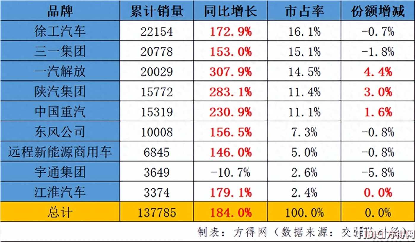 在这个爆发式增长的市场中,徐工汽车以2.22万辆的累计销量和173%的增长率领跑行业。