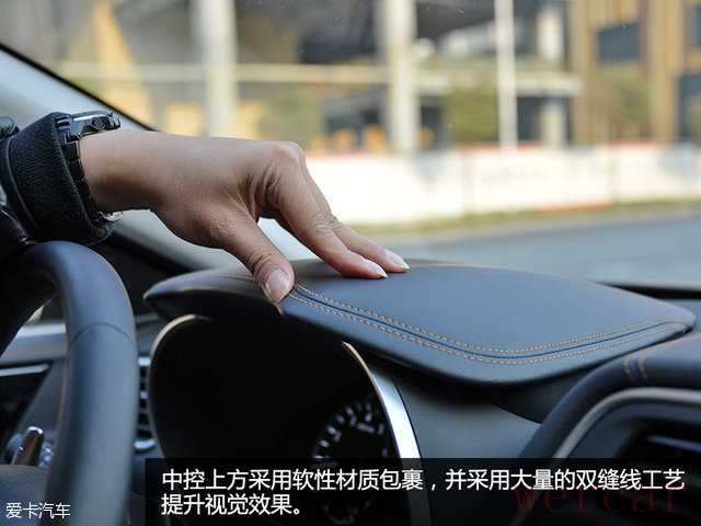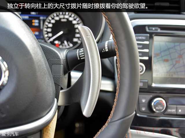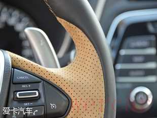 内饰用料的考究以及对于豪华氛围的营造在同级别中也非常突出,中控采用软性材质包裹,随处可见的双缝线工艺大大提升了整体的豪华程度,平底方向盘两侧还采用了打孔处理,手感一流,后侧独立于转向柱的大尺寸换档拨片则随时挑逗着你的驾驶欲望。中控的8英寸屏幕可以用触摸或者挡把后方的按钮操作,非常方便。